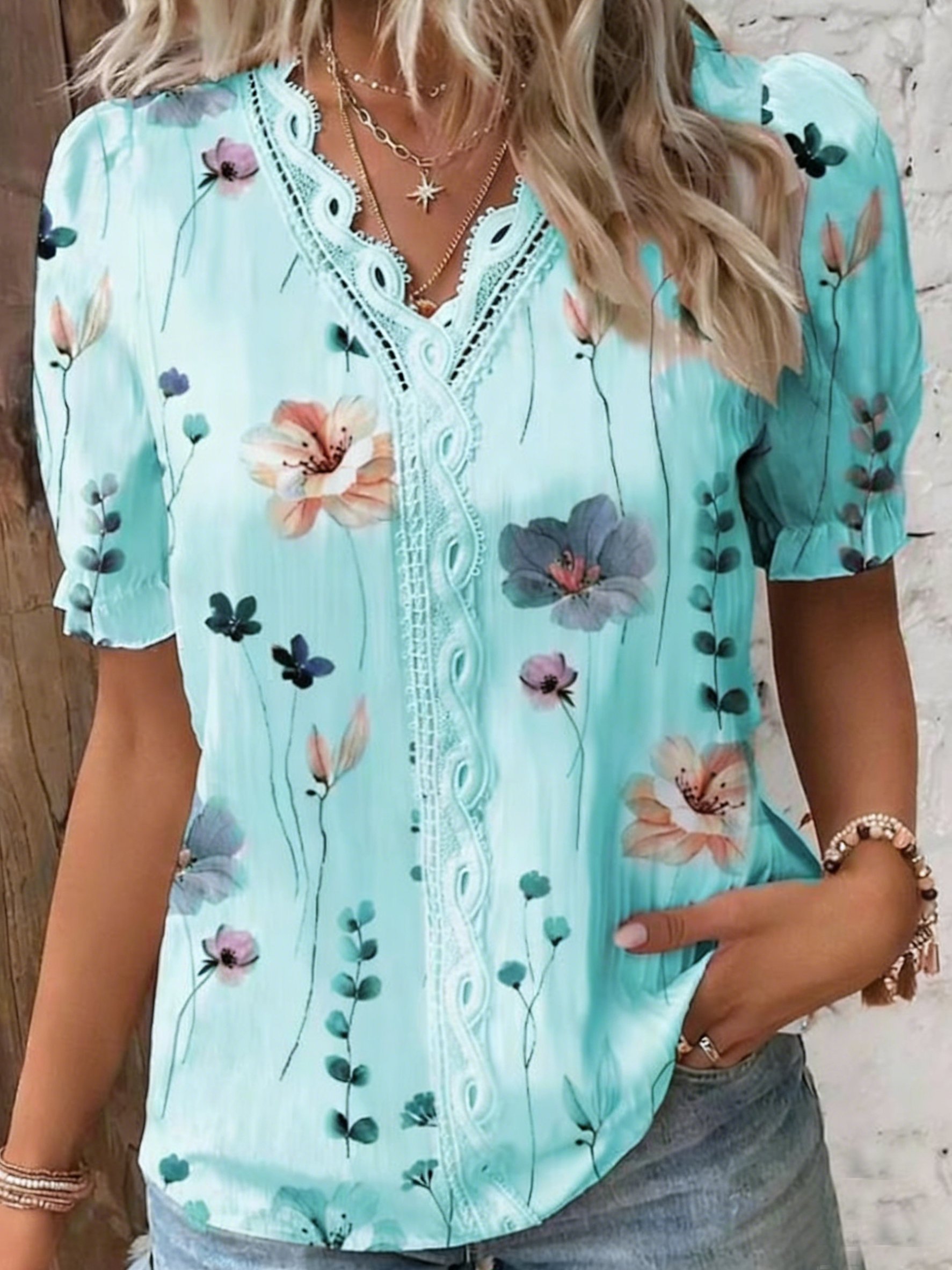 Blue Floral Short Sleeve Ruffle V Neck Lace Trim Summer Going Out Casual Blouse