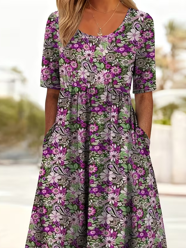 Women's Short Sleeve Summer Purple Floral Printing Crew Neck Daily Going Out Casual Maxi H-Line Shift Dress Dress