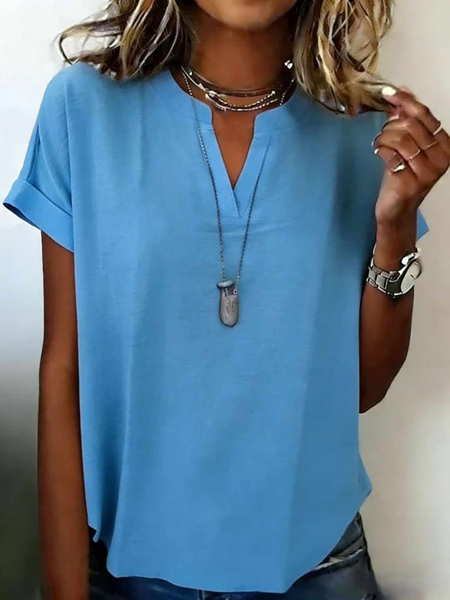 Polyester Cotton V Neck Short Sleeve Casual Blouse