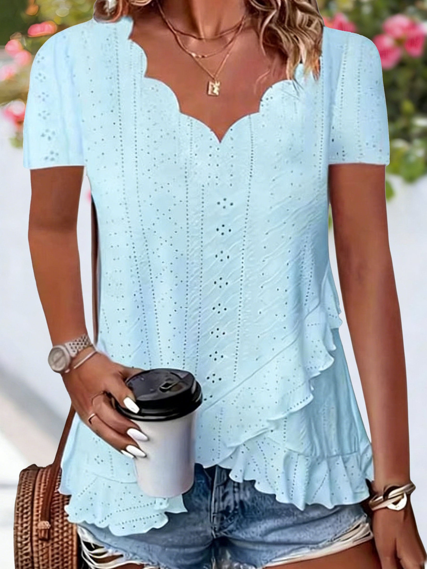 Plain Polyester Cotton V Neck Short Sleeve Scallop Ruffle Hem Edges Casual Top