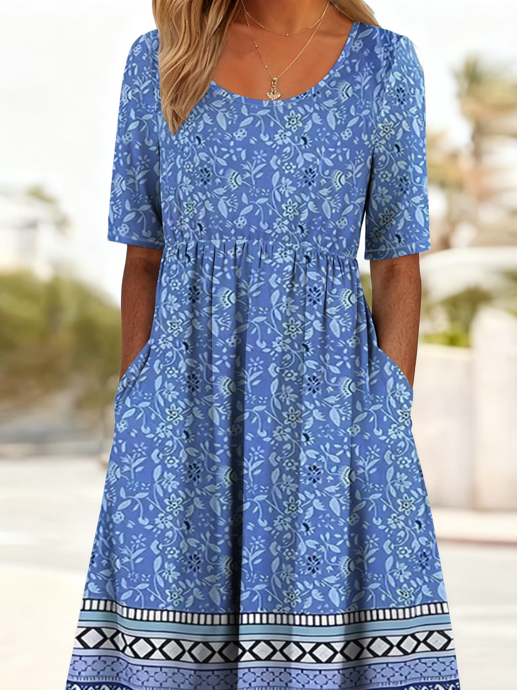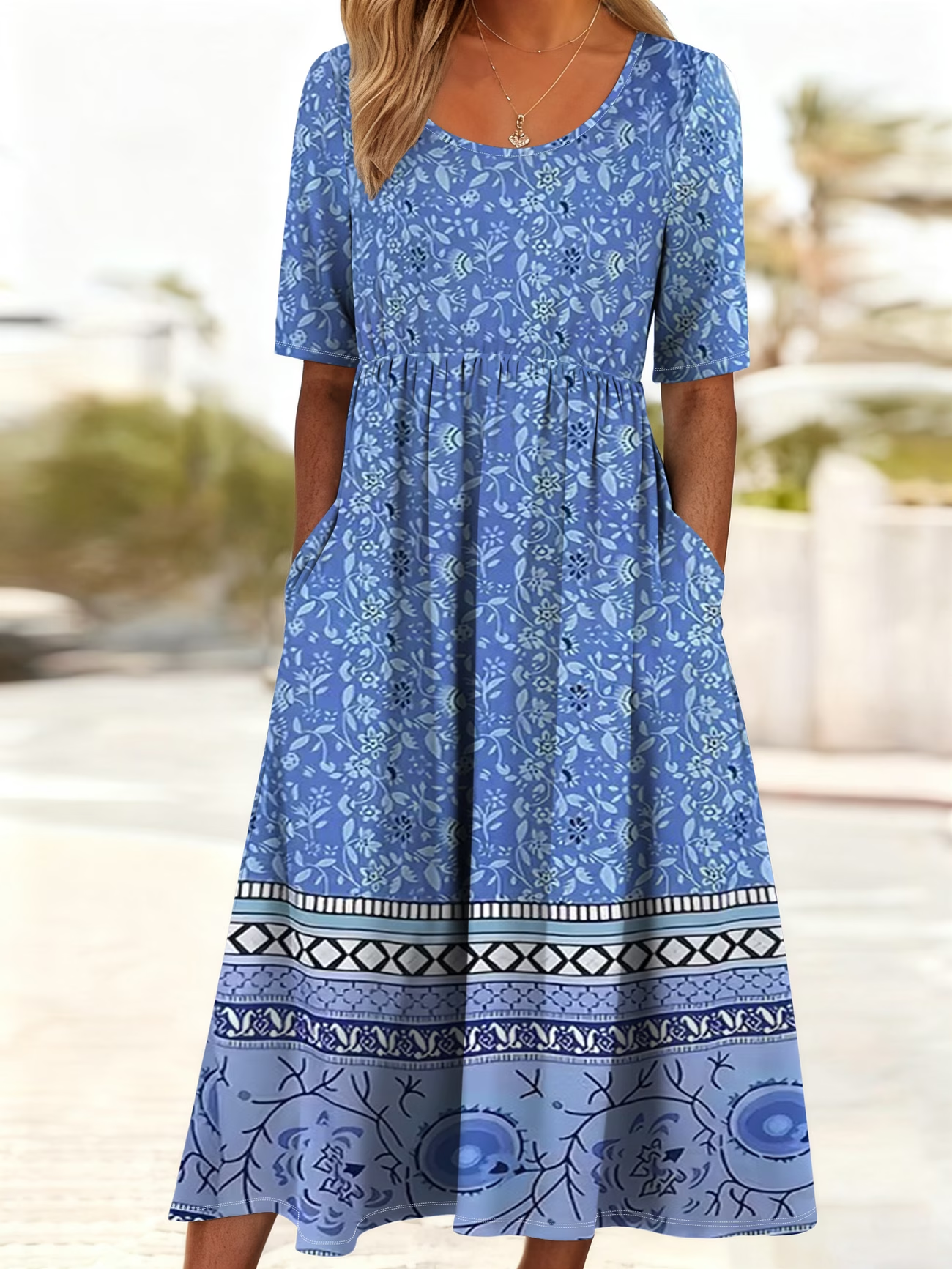Women's Short Sleeve Summer Blue Floral Printing Crew Neck Daily Going Out Casual Maxi H-Line Shift Dress Dress