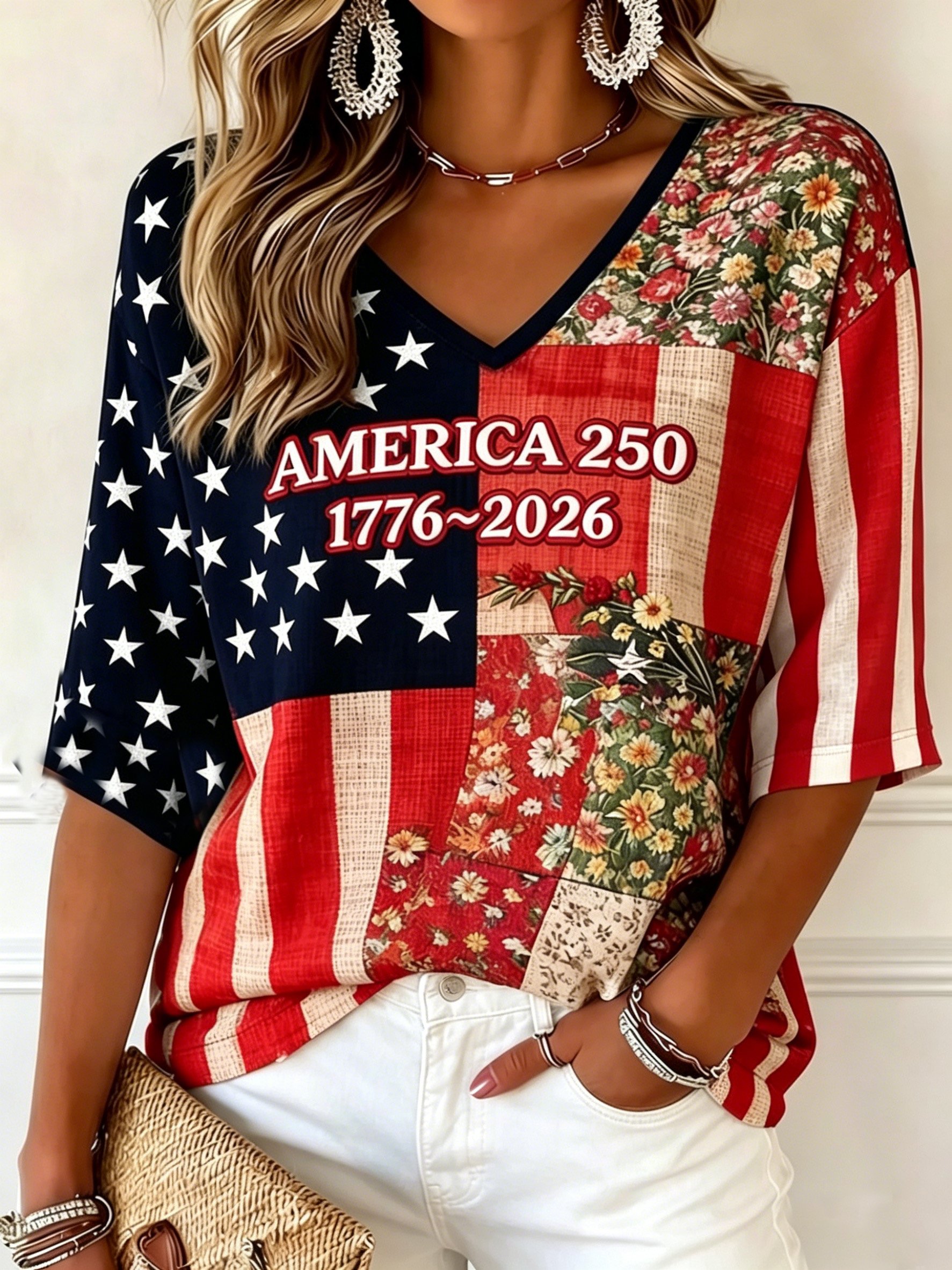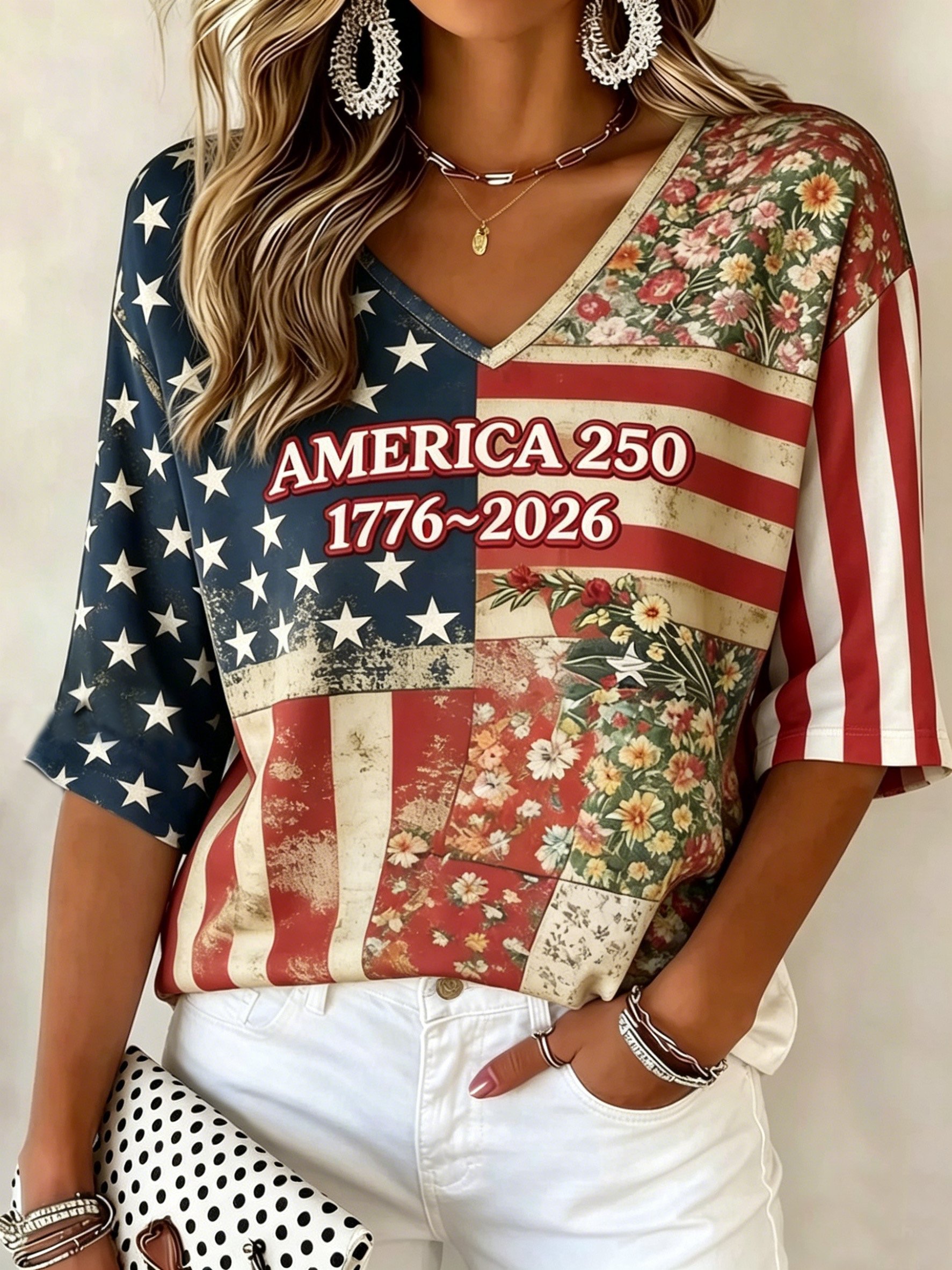 3D Printing V Neck America Flag Floral 250th Anniversary Spring Summer Vintage Casual T-Shirt