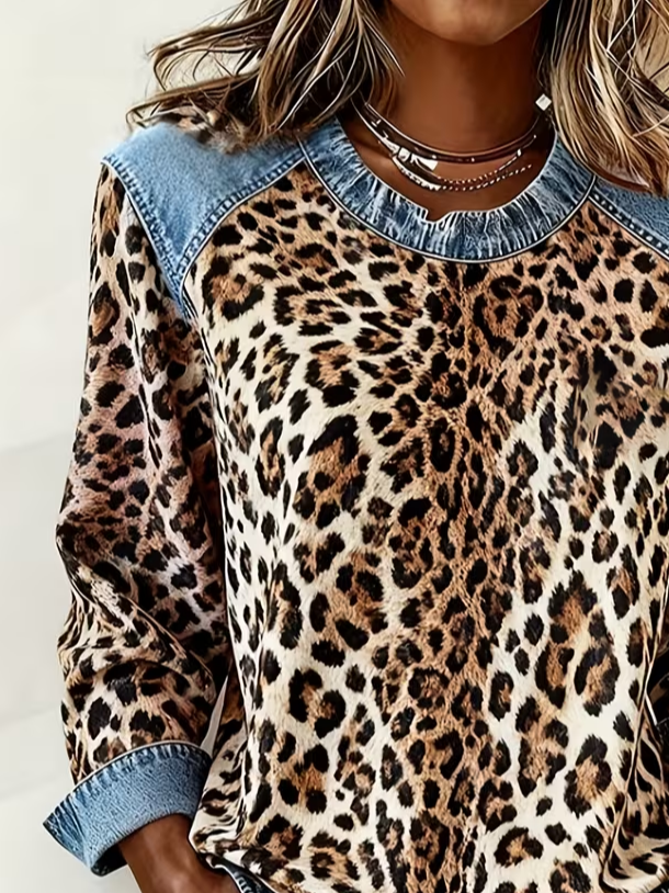 Women's Leopard Print Print Patchwork Denim Crewneck Long-Sleeved Sweatshirt