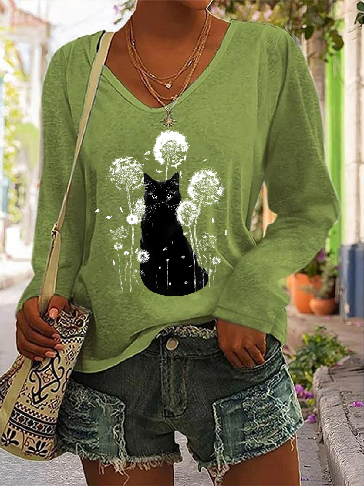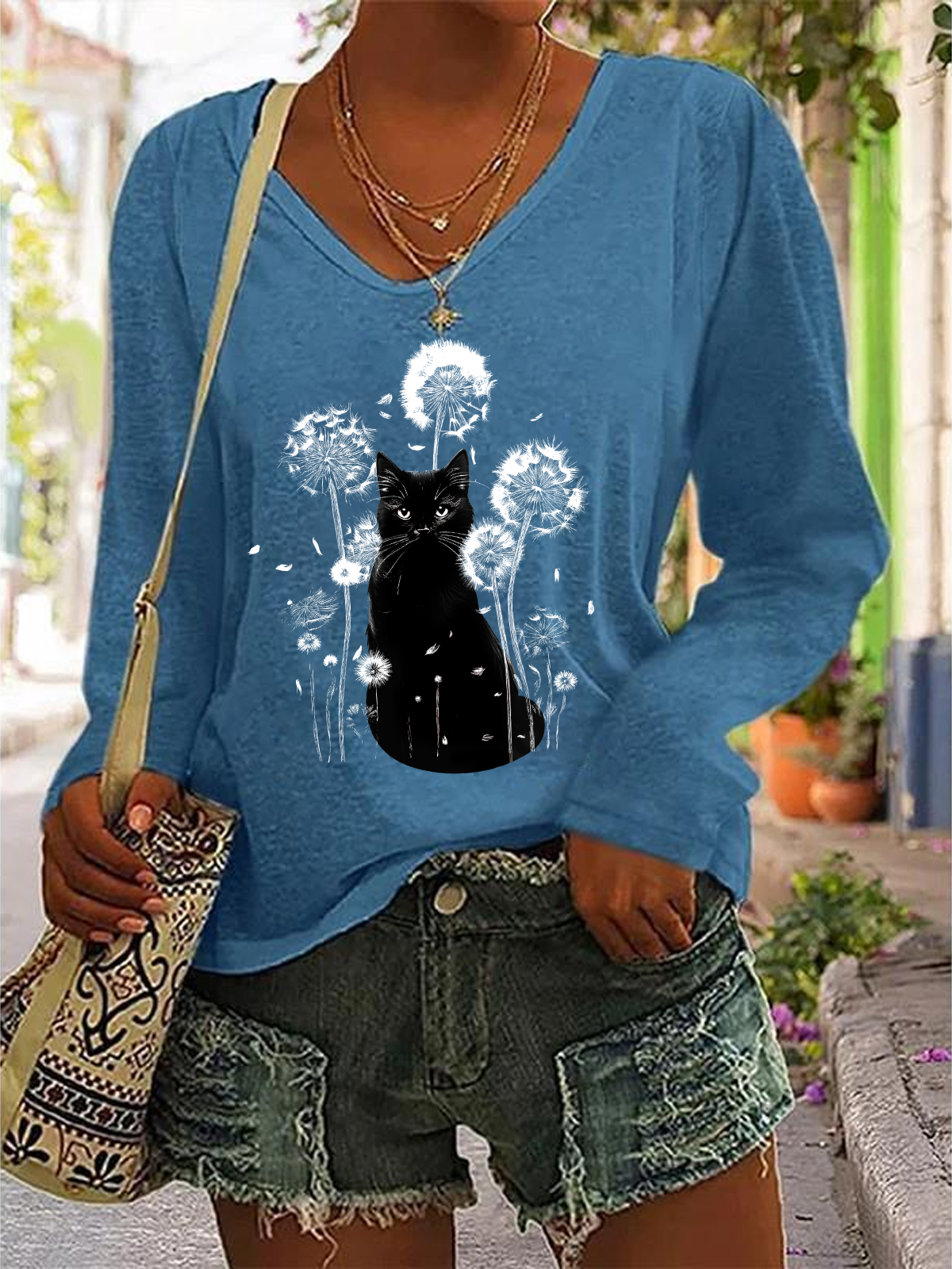 Retro Cat & Dandelion Print Casual V-Neck Long Sleeve Shirt