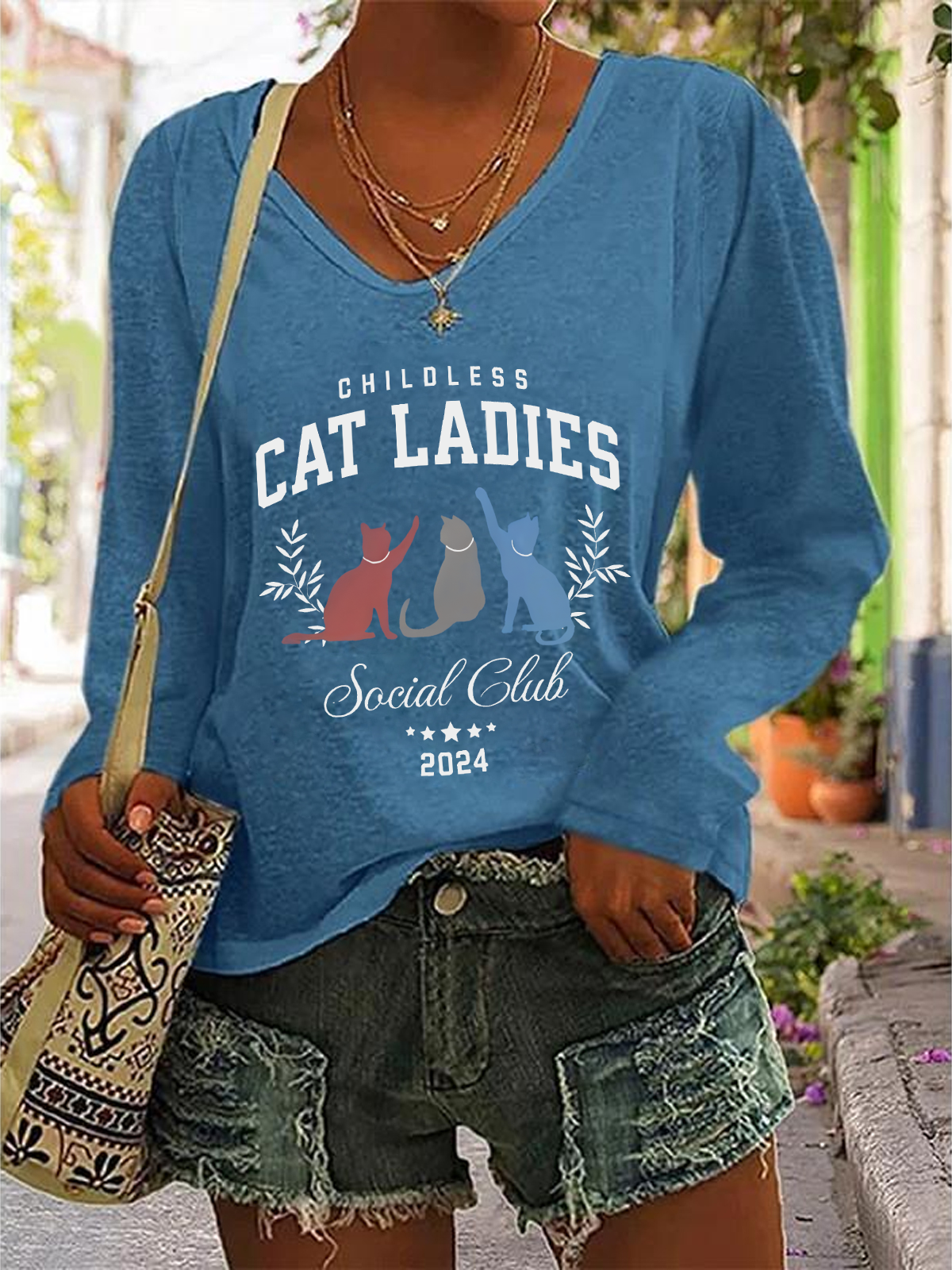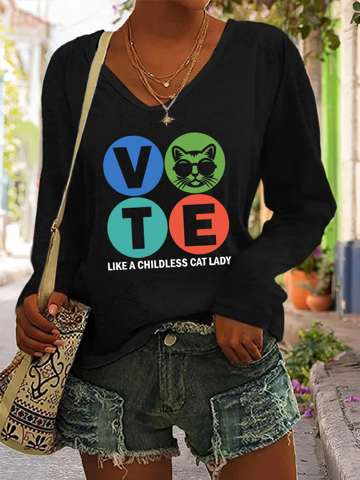 La Cat Vote Vote Like A Childless Cat Lady Casual V-Neck Long Sleeve Shirt