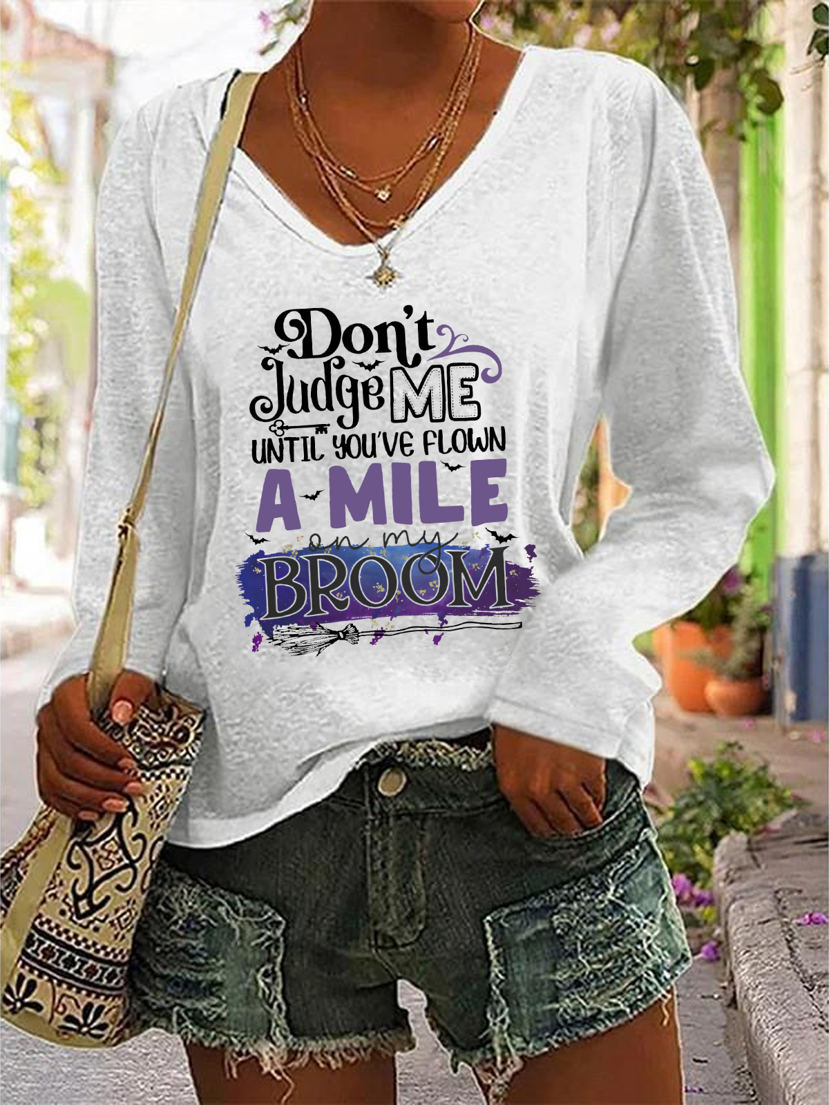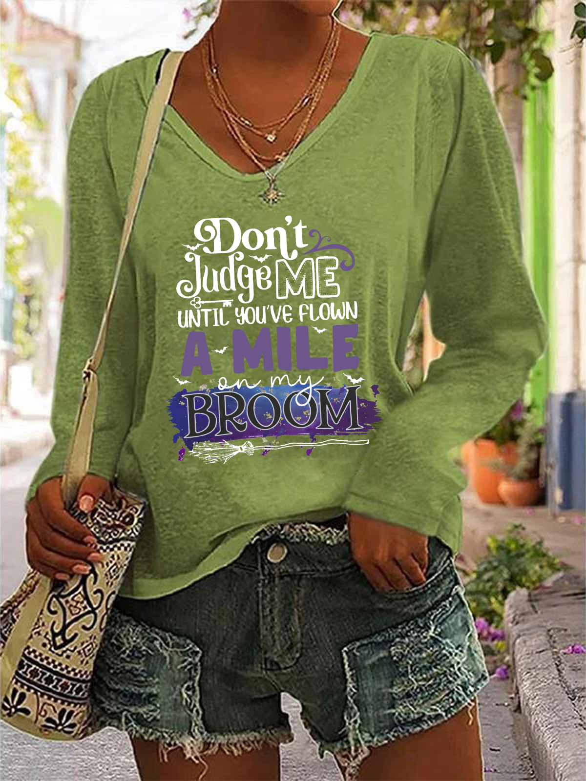Don't Judge Me Until You've Flown A Mile On My Broom Casual V-Neck Long Sleeve Shirt