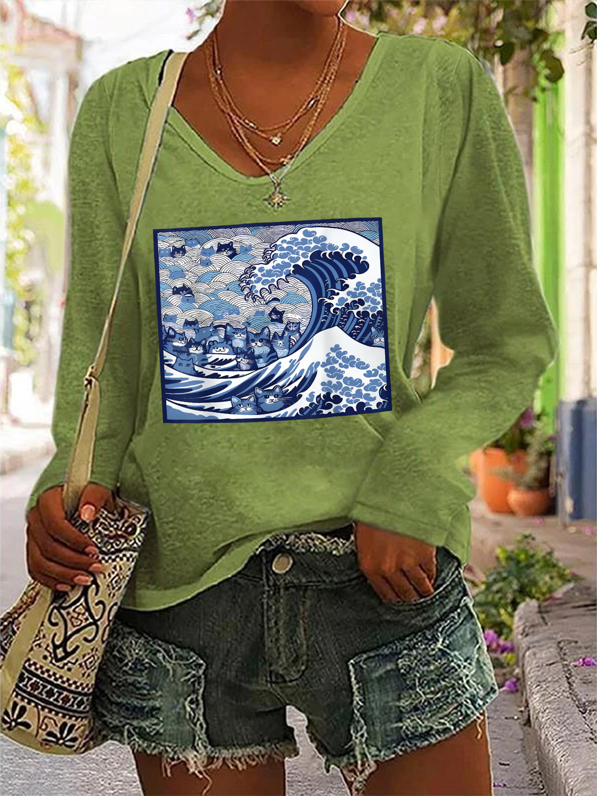 La Cat Vote Blue Cats Wave Casual V-Neck Long Sleeve Shirt