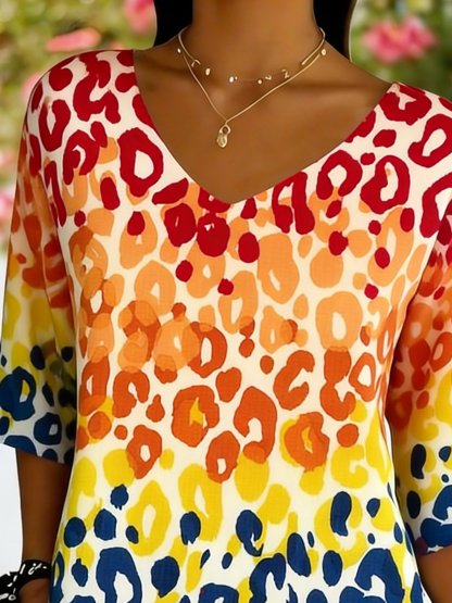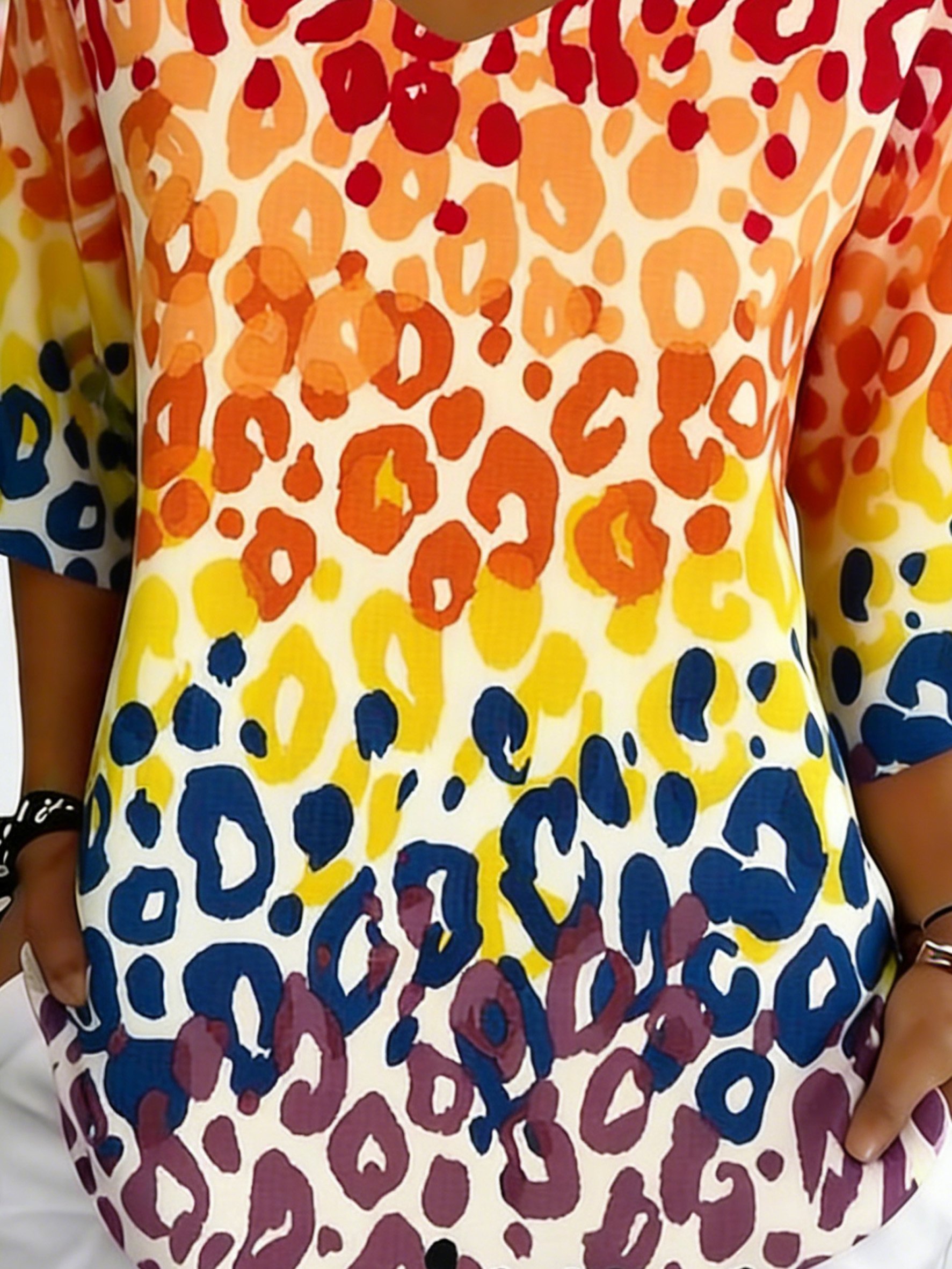 Women's Three Quarter Sleeve T-shirt Spring/Fall Colorful Leopard V Neck Daily Going Out Casual Top