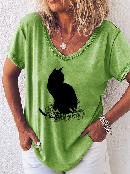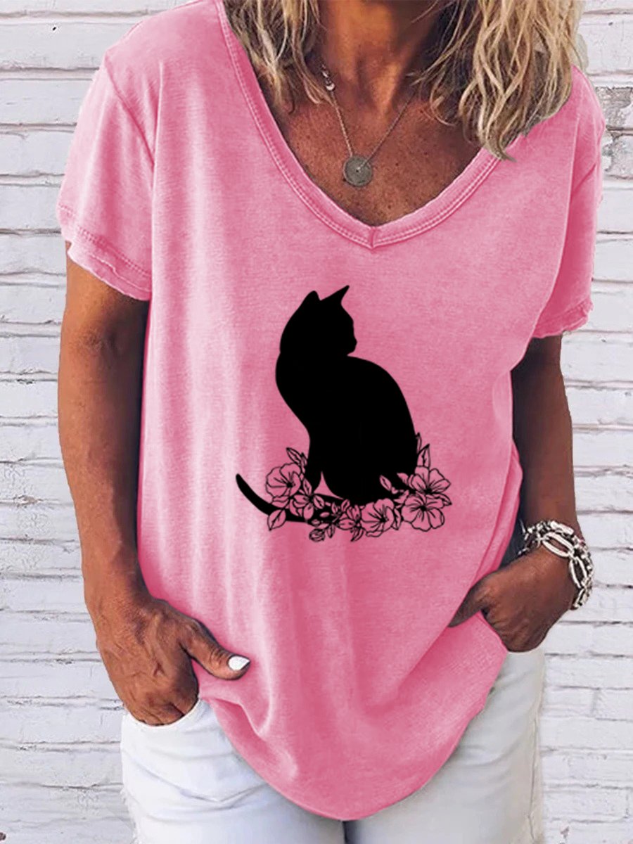 Casual Simple Cat Floral Print V-Neck T-Shirt