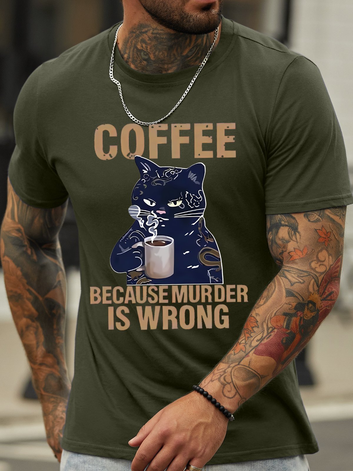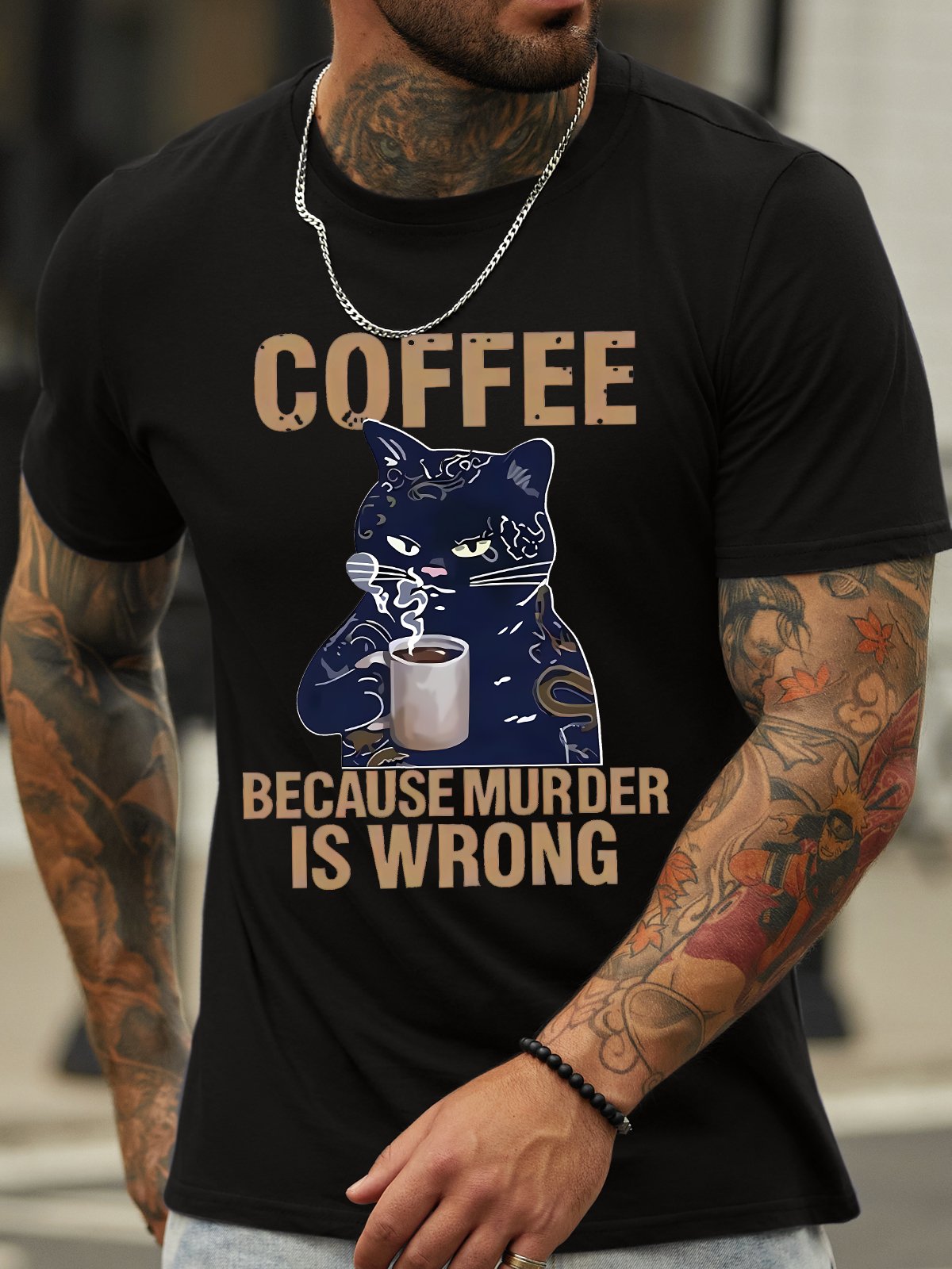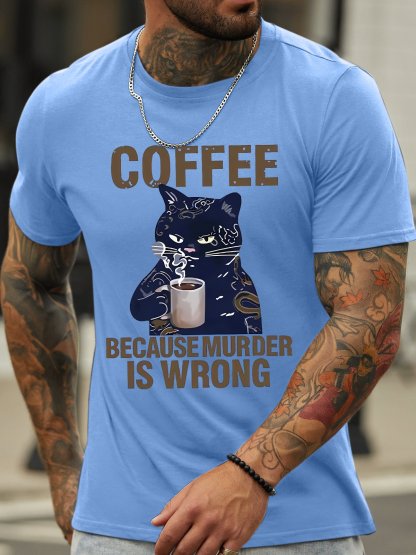 Men's Coffee Because Murder Is Wrong Funny Black Cat Graphic Printing Crew Neck Casual Text Letters Cotton T-Shirt