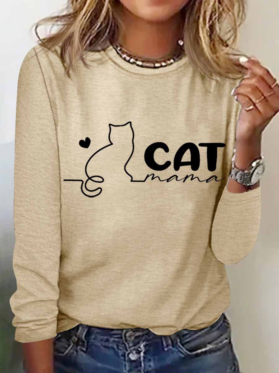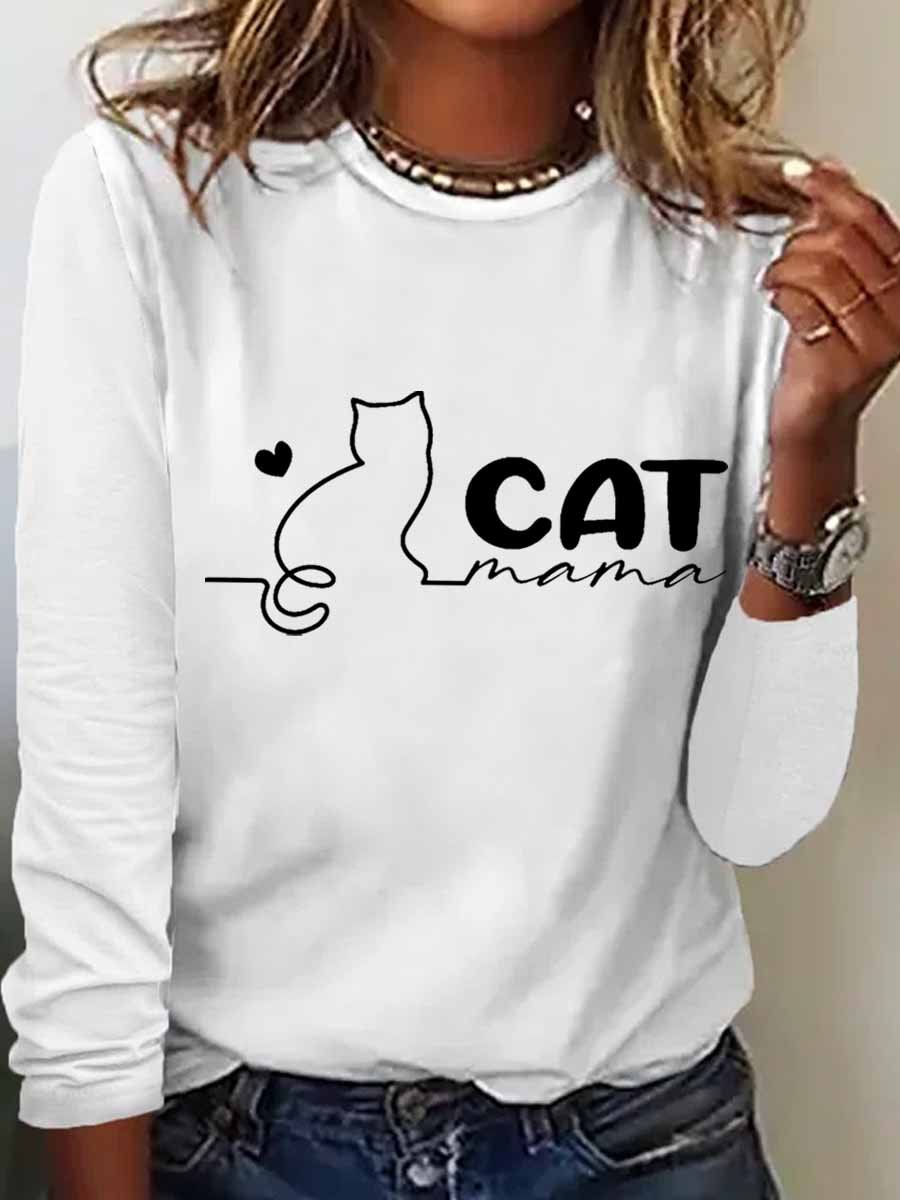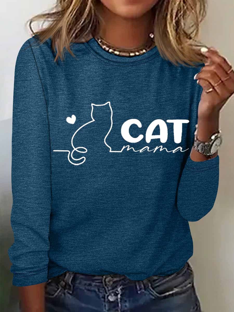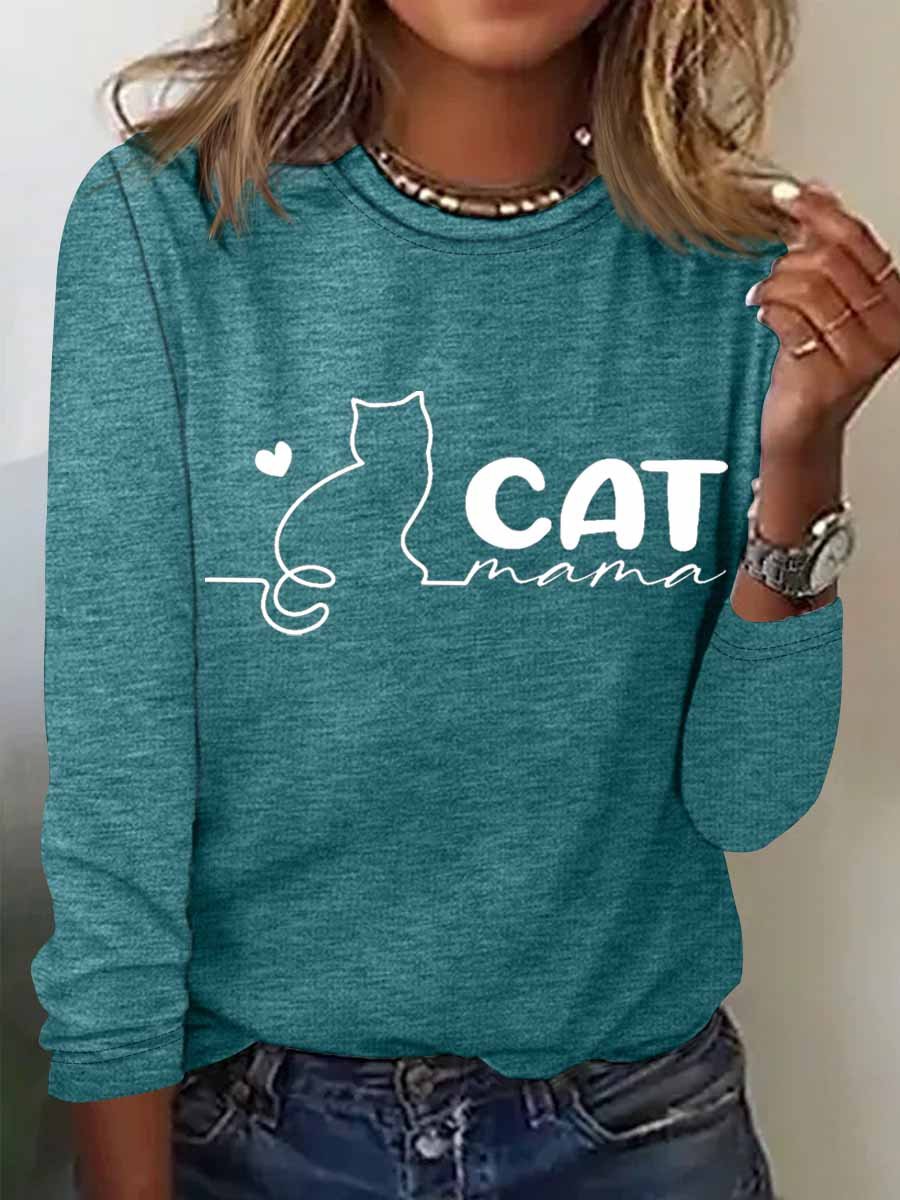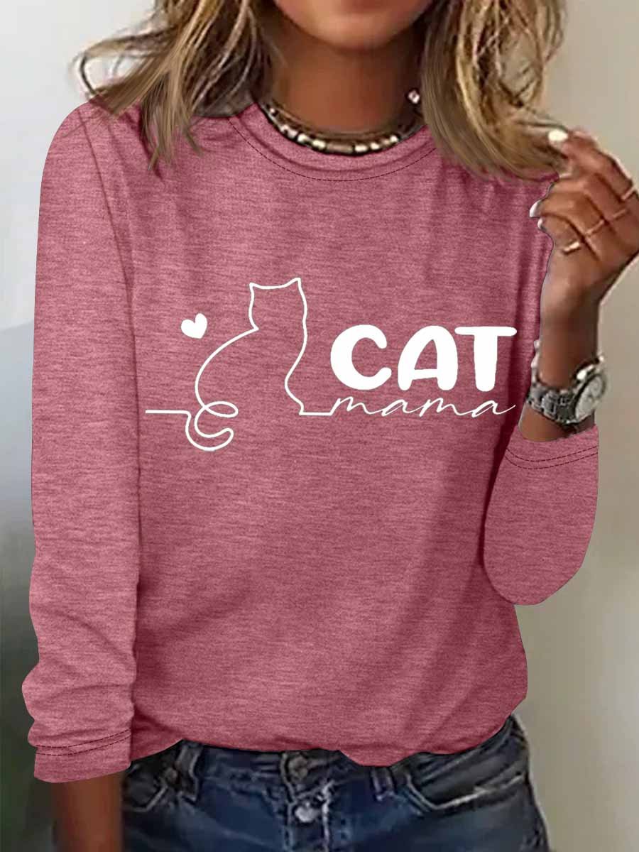 Women's Cat mama Regular Fit Heart Simple Cotton-Blend Long Sleeve Top