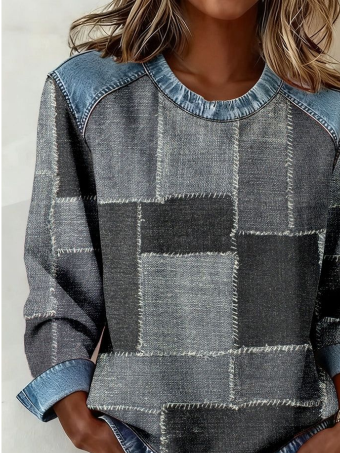 Women's Abstract Print Patchwork Denim Crewneck Long-Sleeved Sweatshirt
