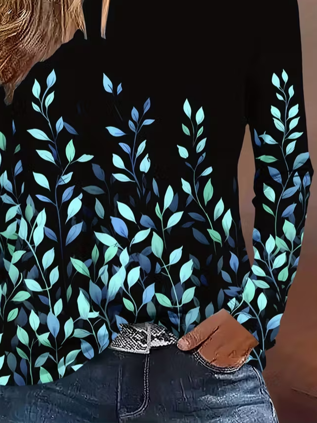 Women's Long Sleeve T-shirt Spring/Fall Black Leaf Printing Jersey Crew Neck Daily Going Out Casual Top