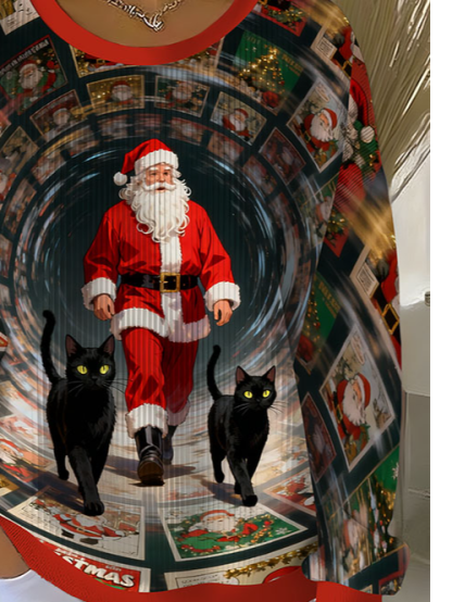 Women's time-traveling Santa Claus and cat print ugly sweatshirt