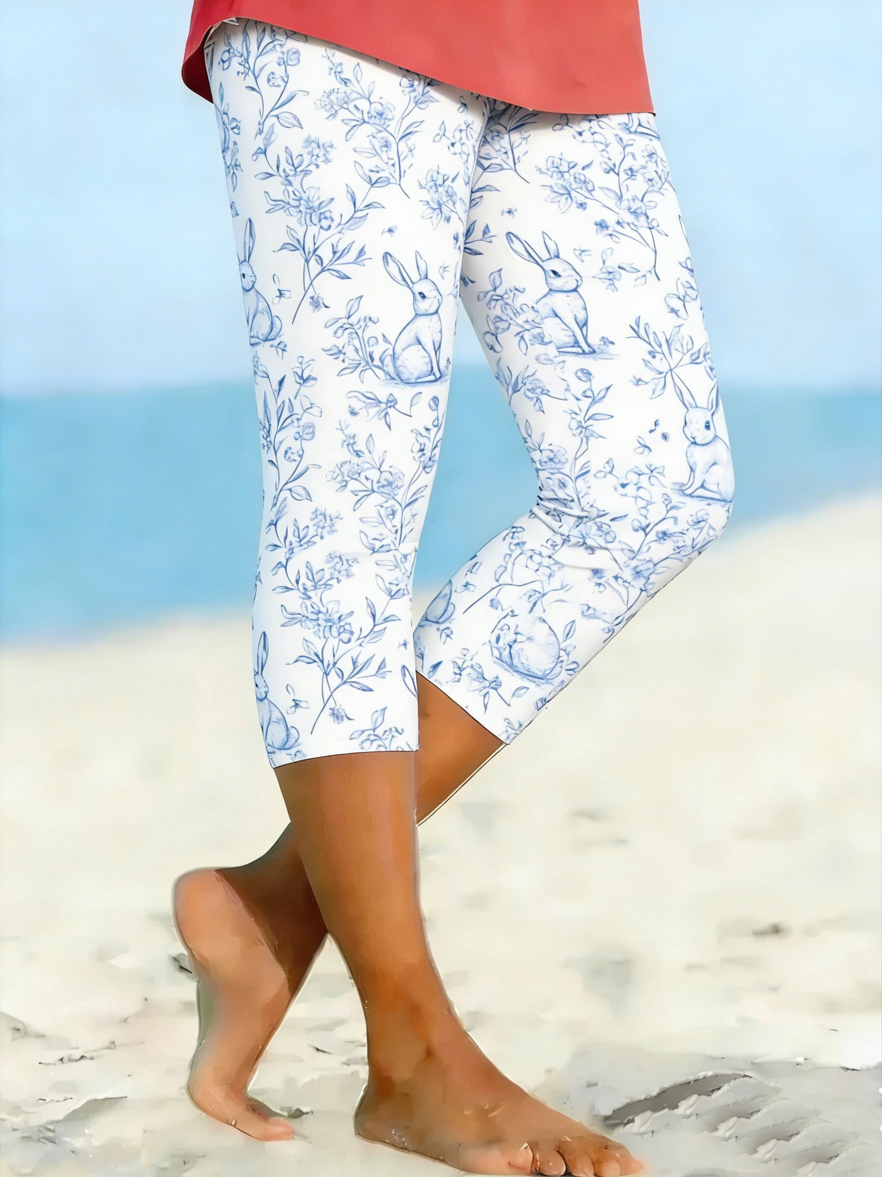 Blue 3D Printing Easter Rabbit Floral Tight Casual Leggings