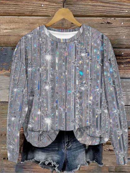 Silver Glitter Effect With Colorful Dots And Vertical Stripes Sweatshirt