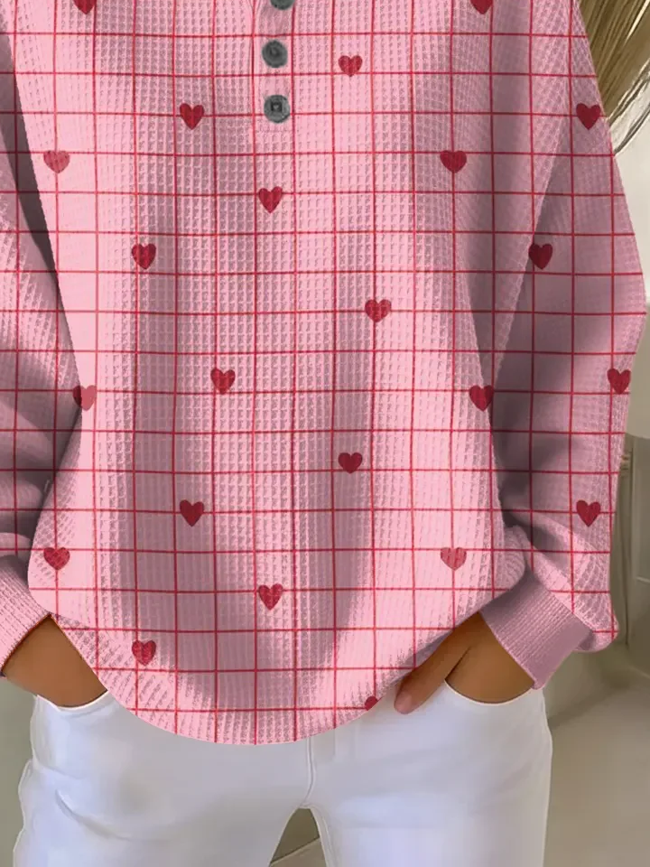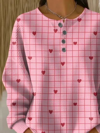 Women's Love Print Button-Up Casual Waffle Knit Sweatshirt