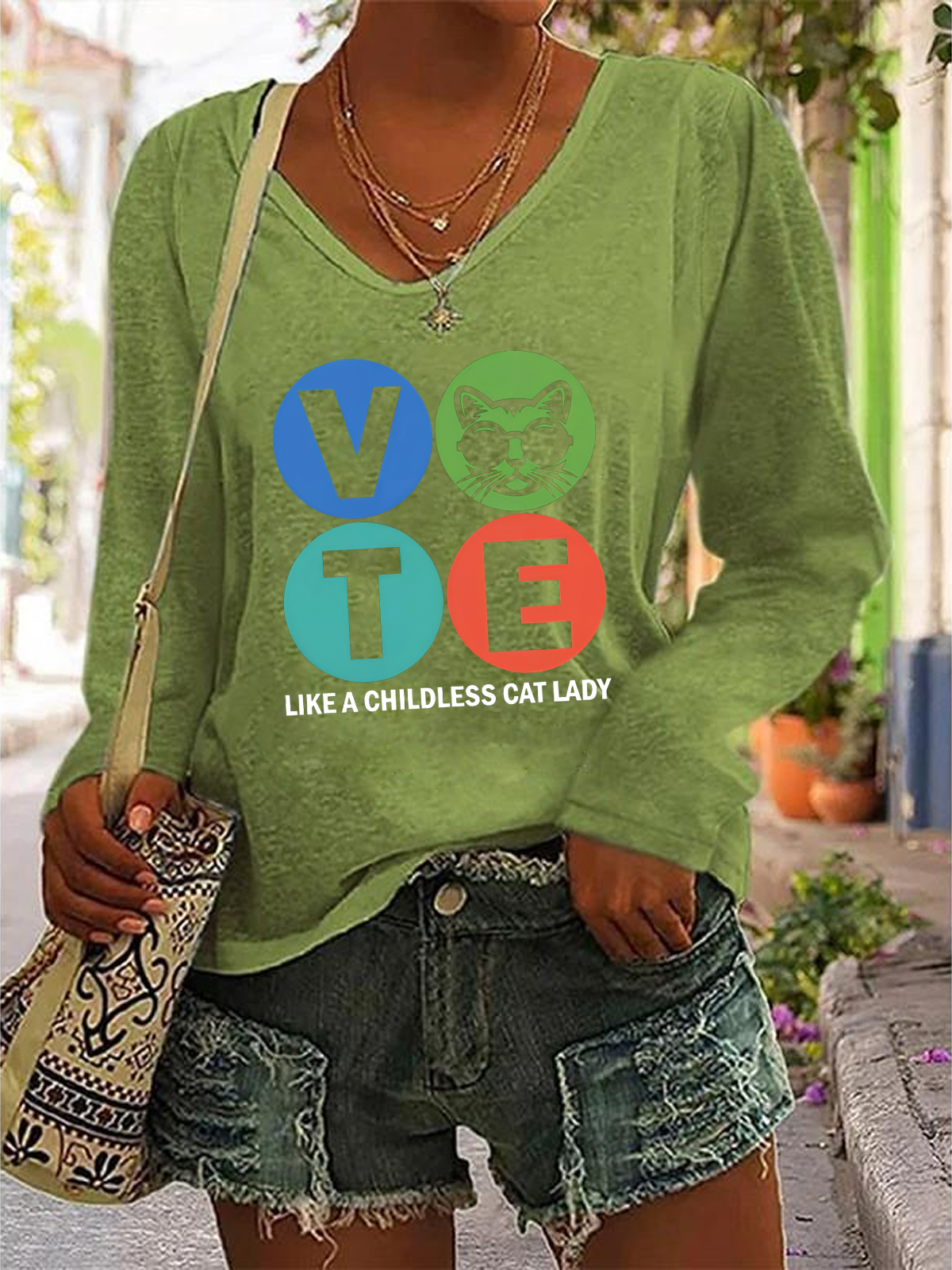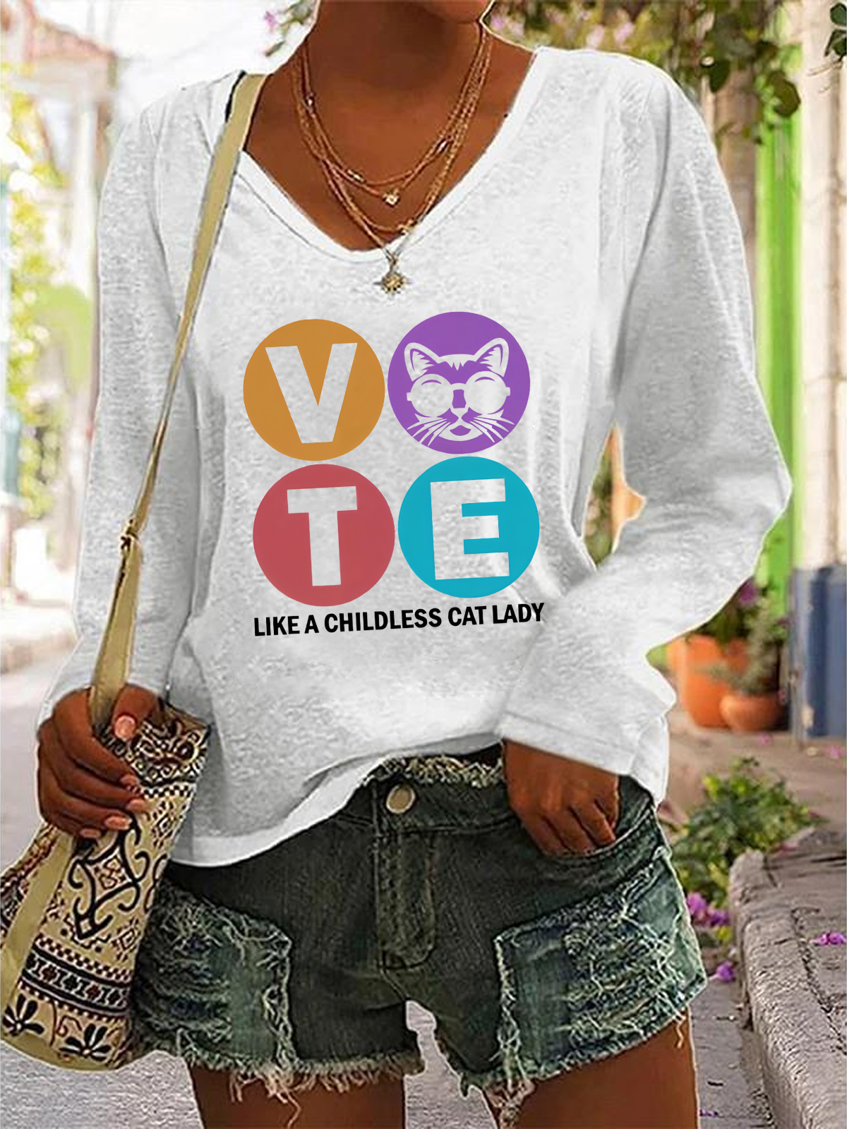 La Cat Vote Vote Like A Childless Cat Lady Casual V-Neck Long Sleeve Shirt