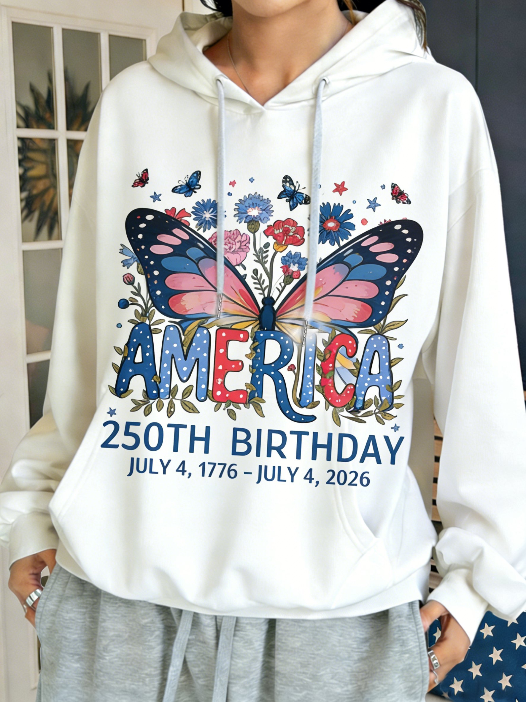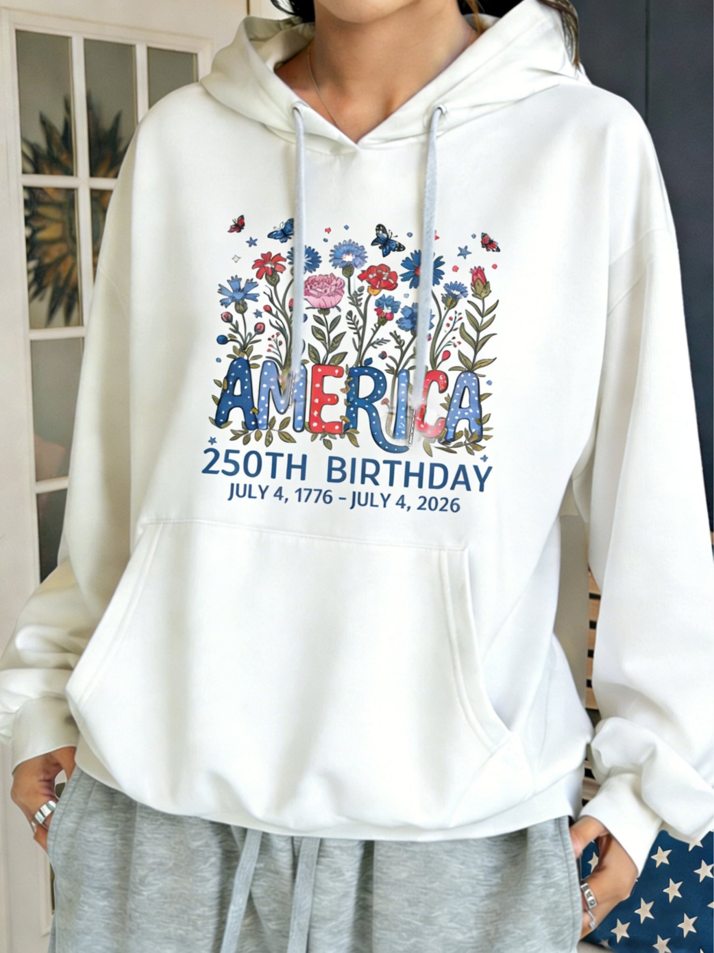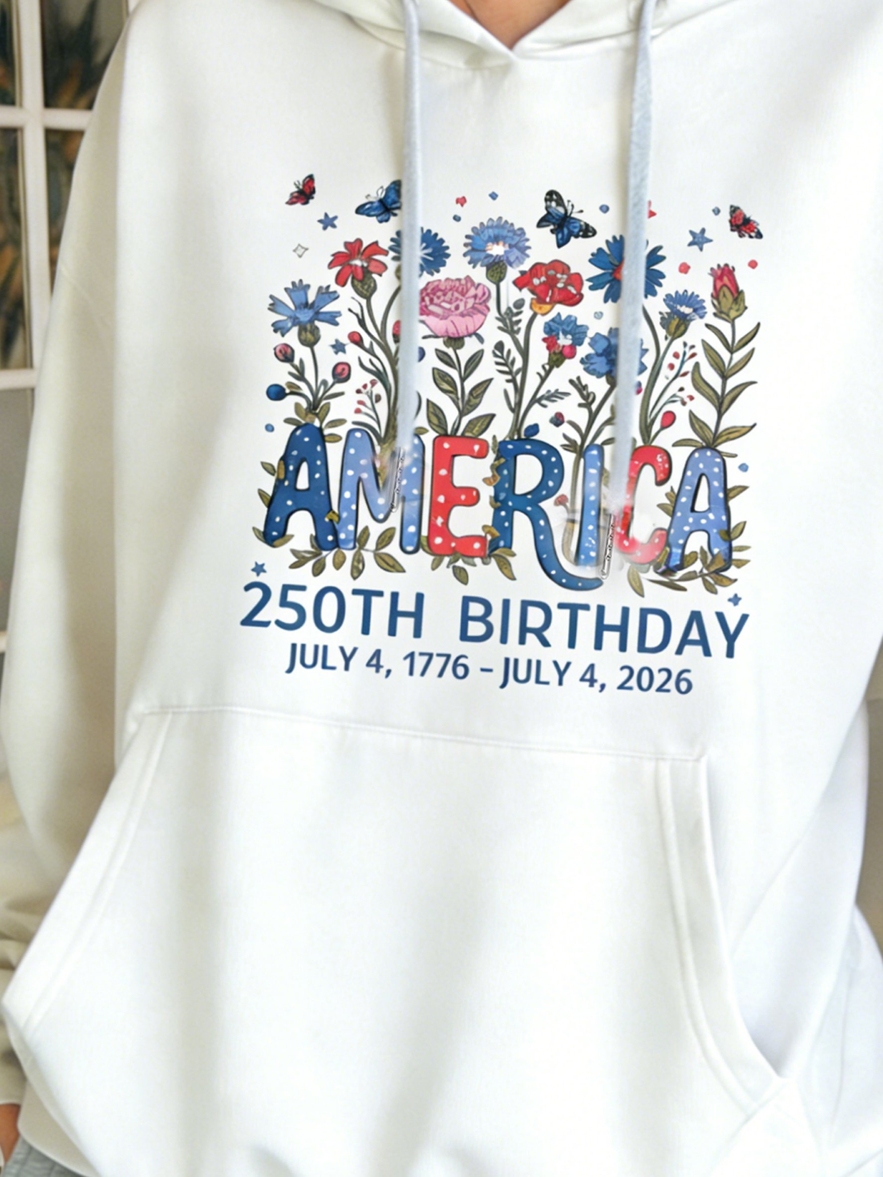 3D Printing America Flag Round Neck Floral 250th Anniversary Casual Hoodie