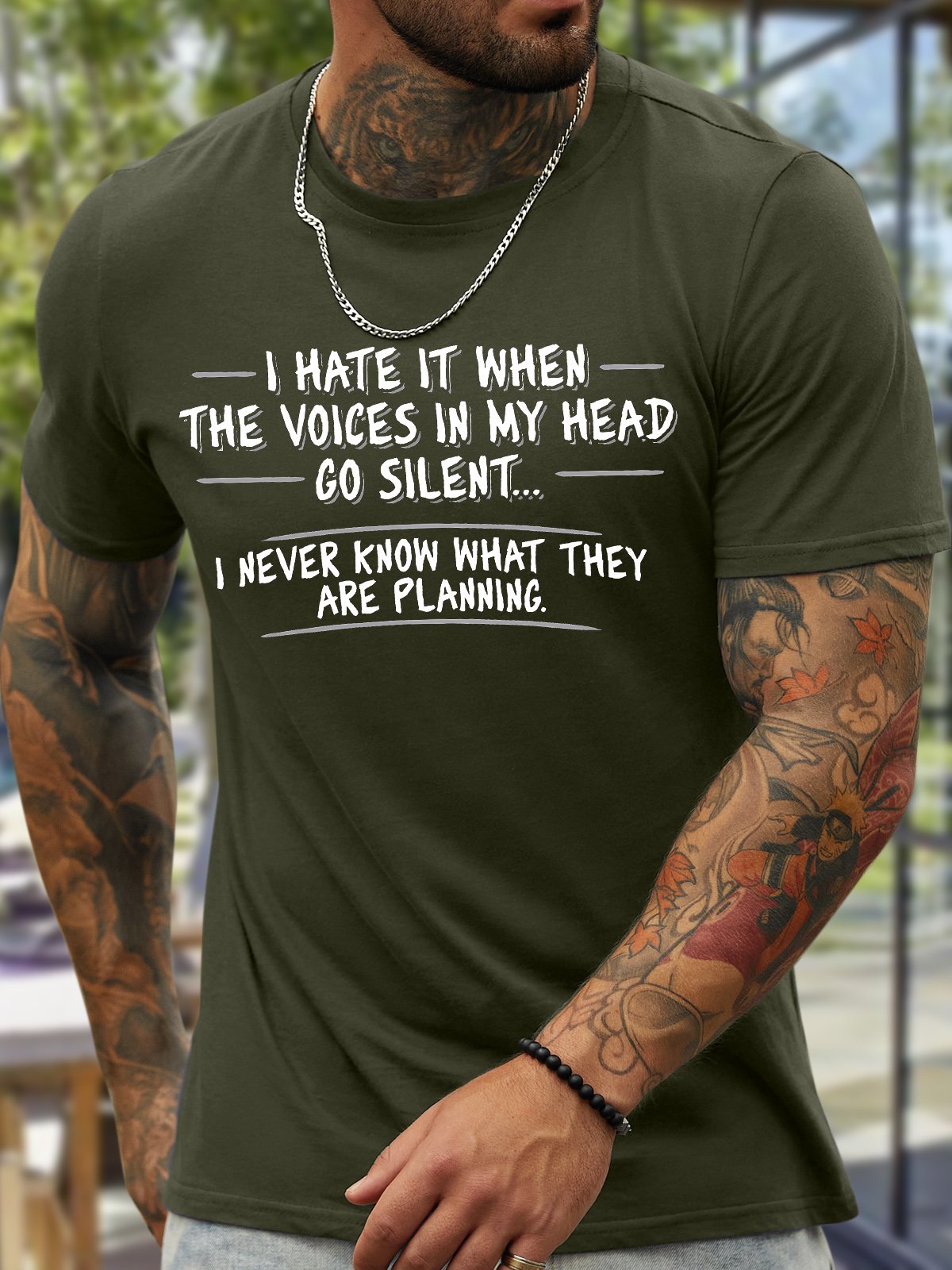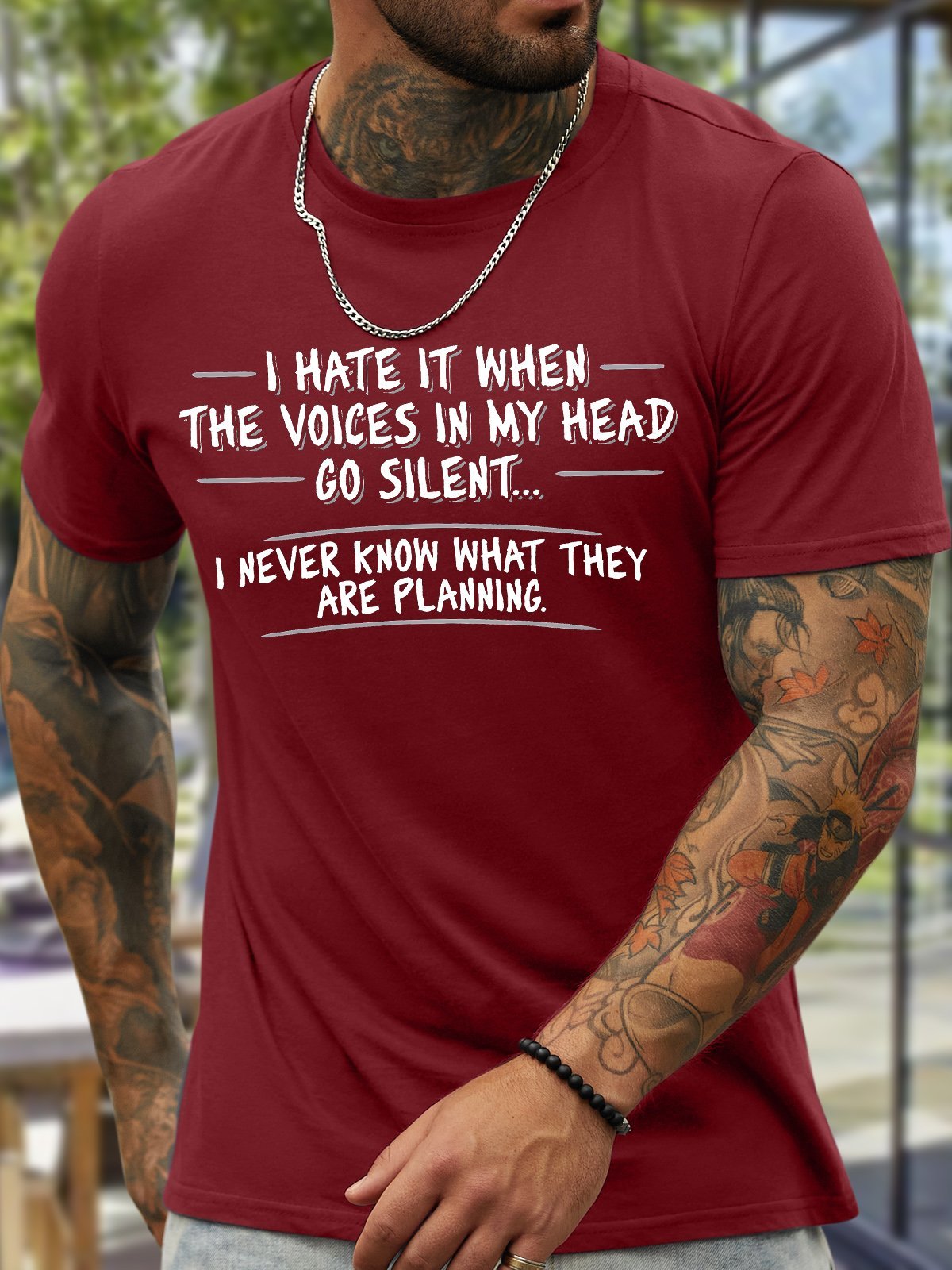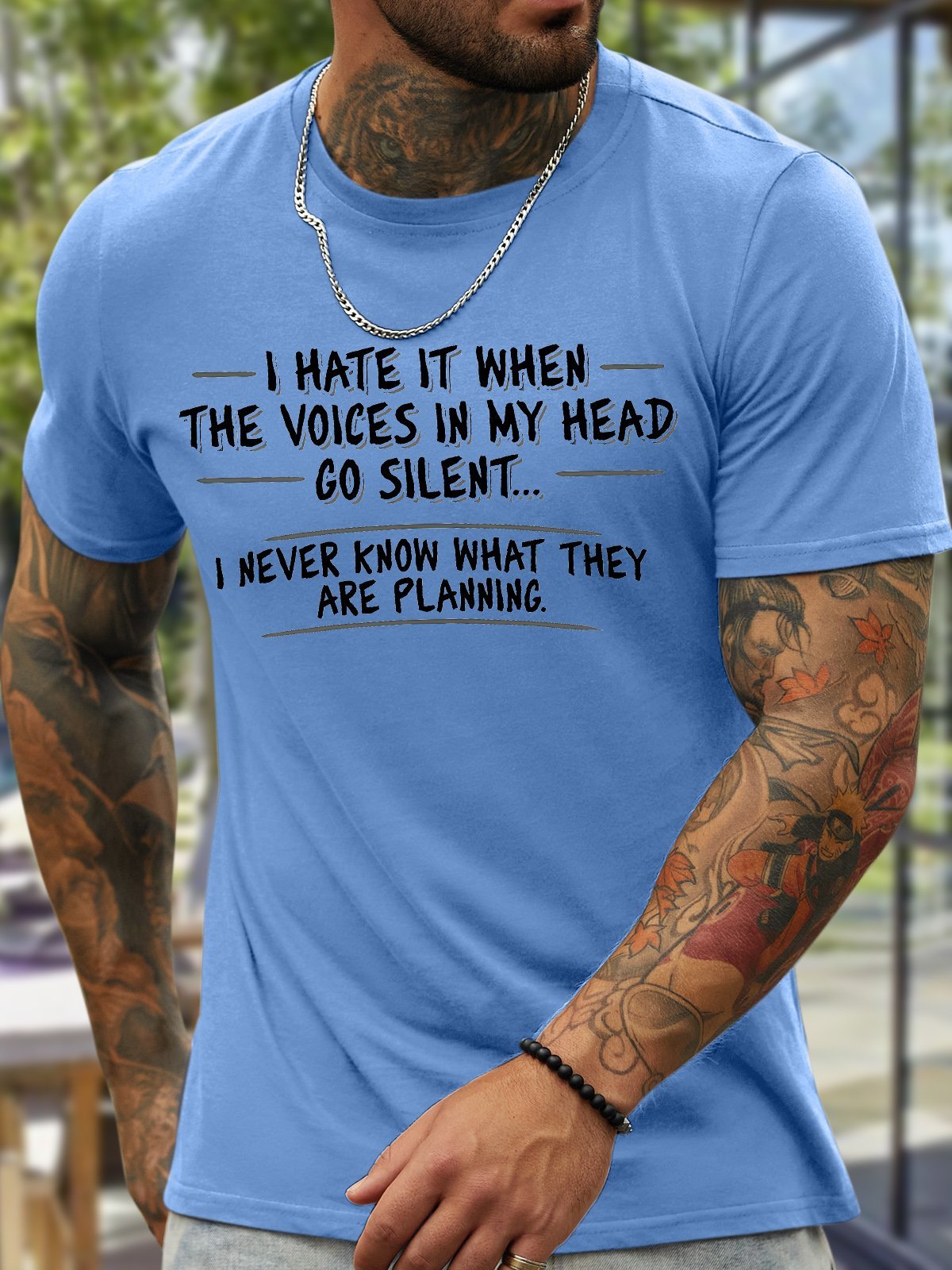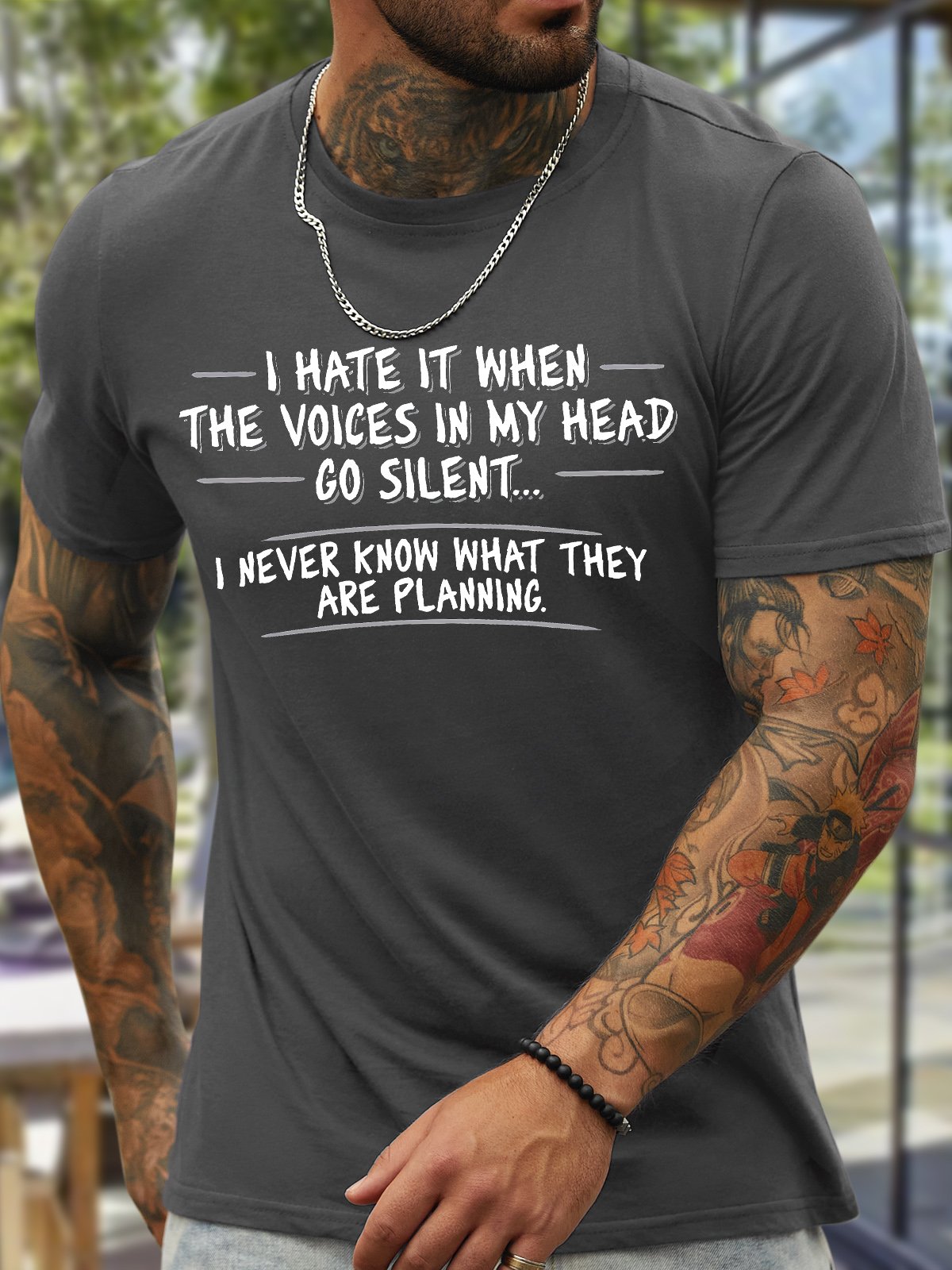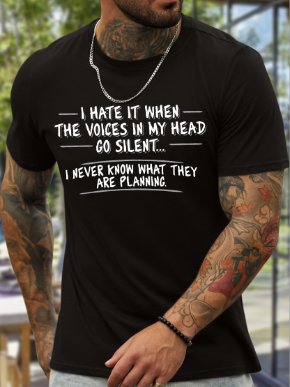 Men's I Hate It When The Voices In My Head Go Silent I Never Know What They Are Planning Funny Graphic Printing Cotton Text Letters Casual Crew Neck T-Shirt