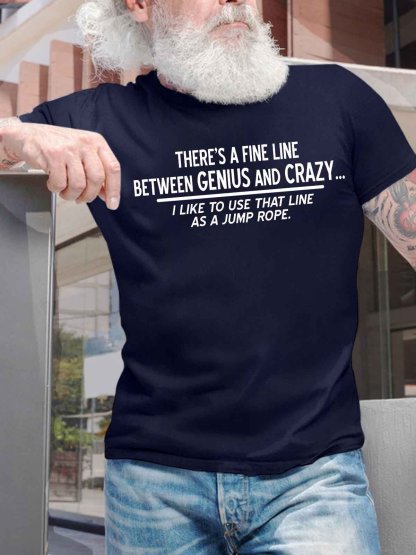 Men's There's A Fine Line Between Genius And Crazy I Like To Use That Line As A Jump Rope Funny Graphic Printing Crew Neck Casual Cotton T-Shirt