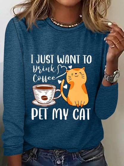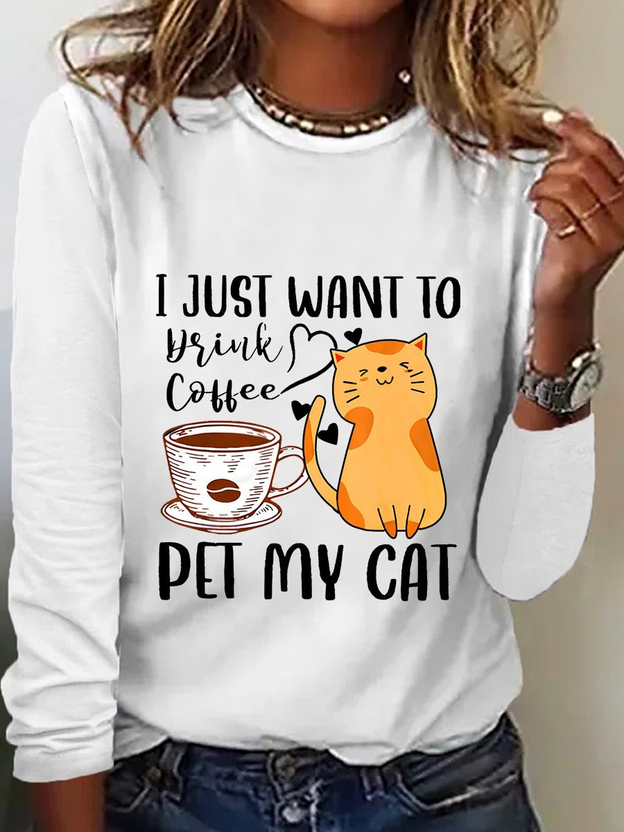 Meowy I Just Want To Drink Coffee And Pet My Cat Funny Cat Sarcastic Long sleeve Shirt