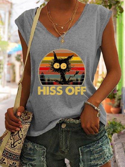 Hiss Off Funny Cat Print V-Neck Tank Top