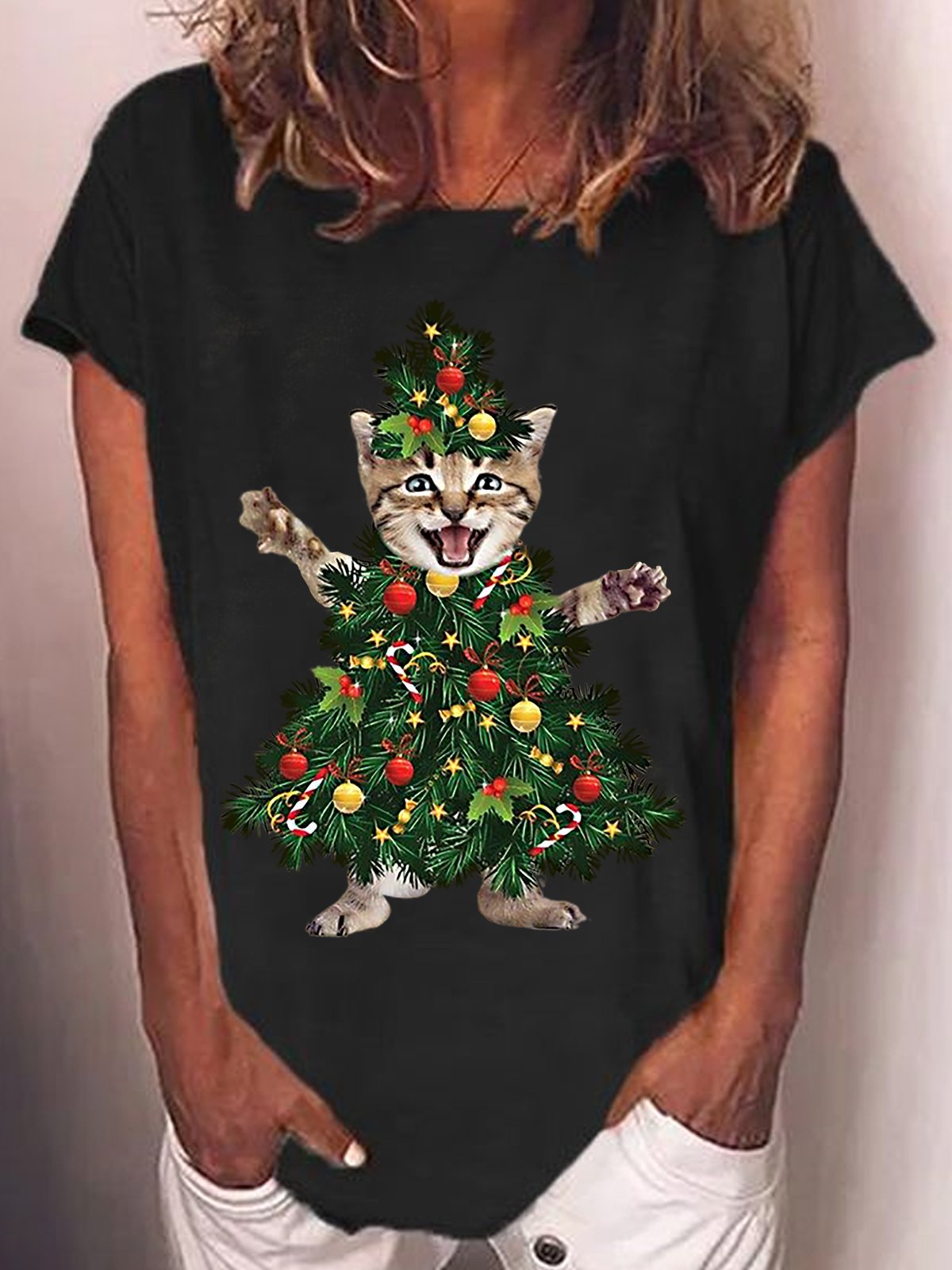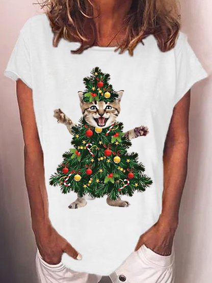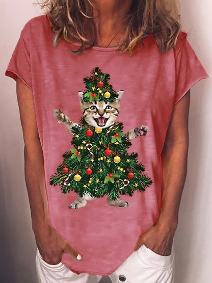 Womens Christmas Tree Cat Crew Neck T-Shirt