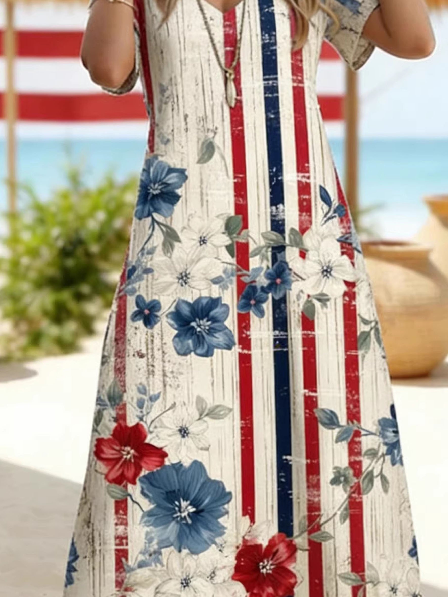 Women's Short Sleeve Summer As Picture Floral Printed Independence Day V Neck Short Sleeve Daily Going Out Casual Maxi A-Line T-Shirt Dress 250th Anniversary