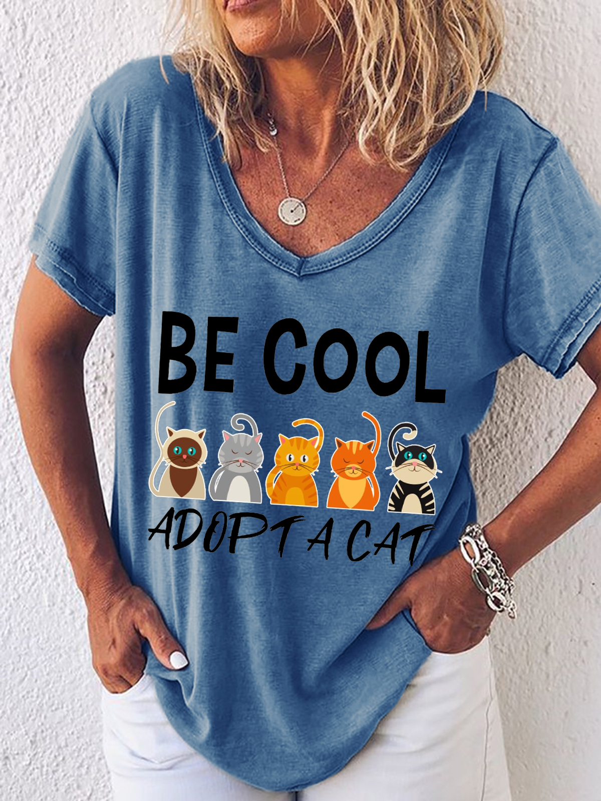 Women's Cat Lover Cat Adoption Loose Simple V Neck T-Shirt
