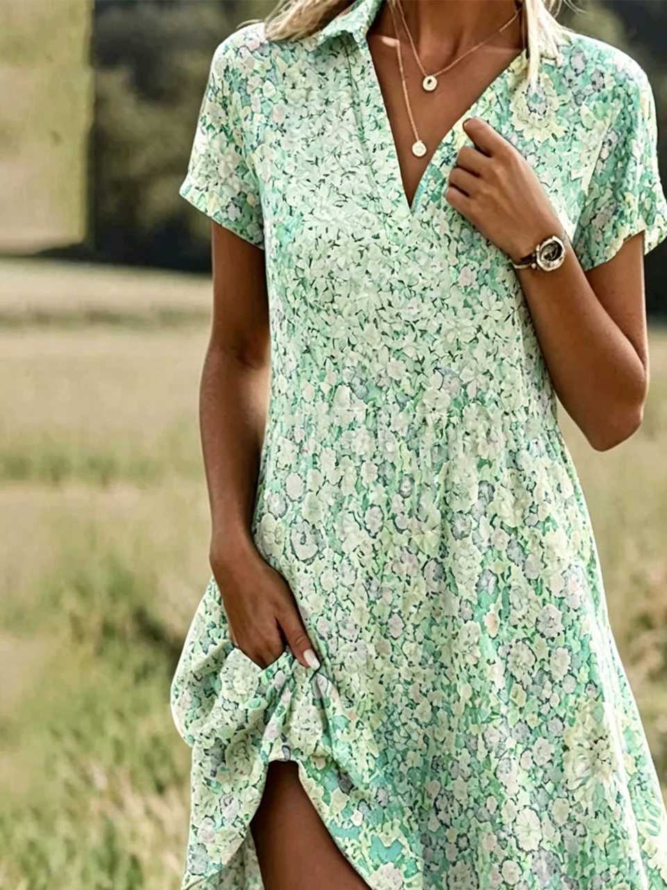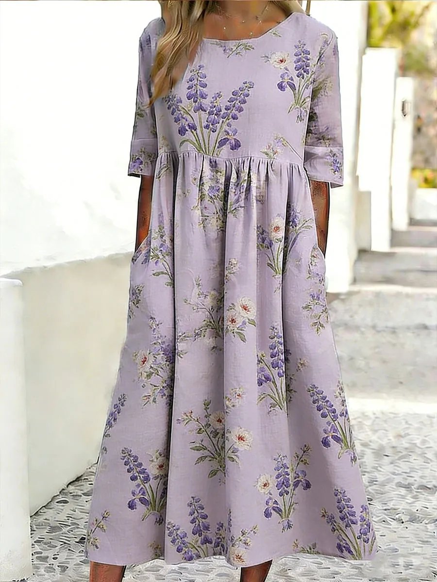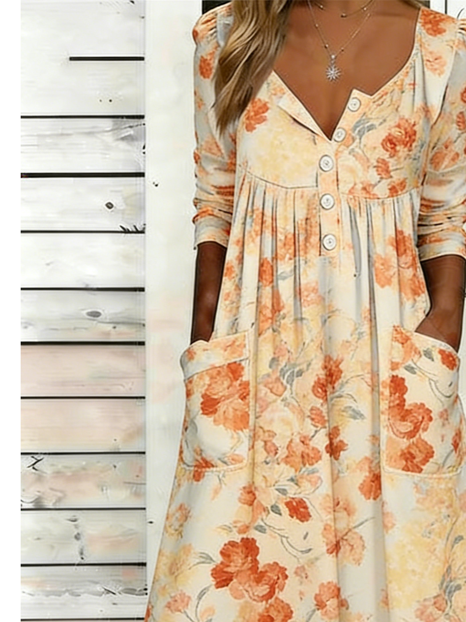 Floral Loose Half Open Collar Casual Dress With No