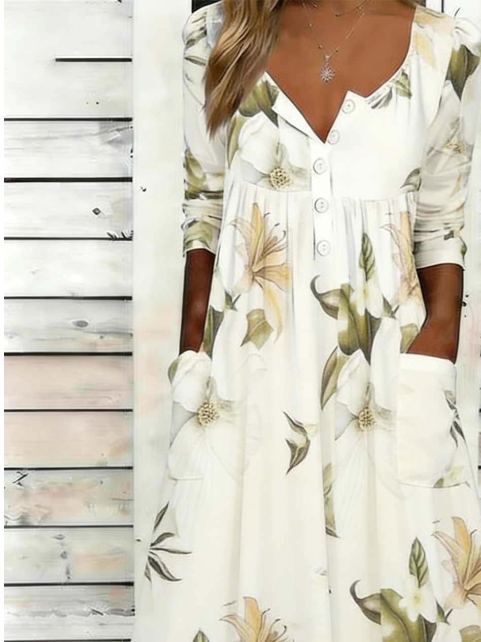 Half Open Collar Loose Casual Botanical Pattern Dress With No