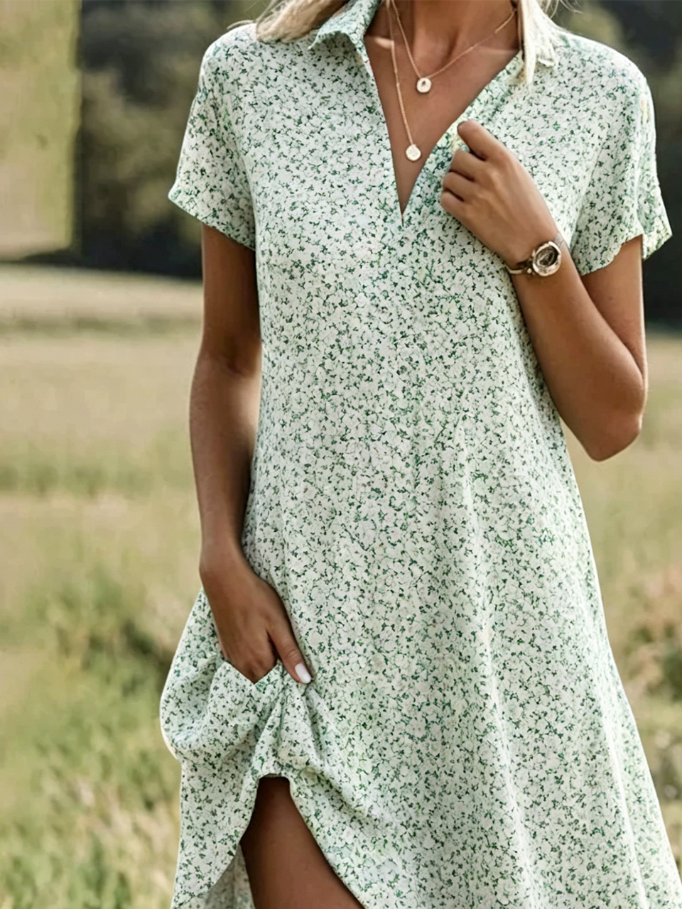 Casual Ditsy Floral Shawl Collar Shirt Dress With No