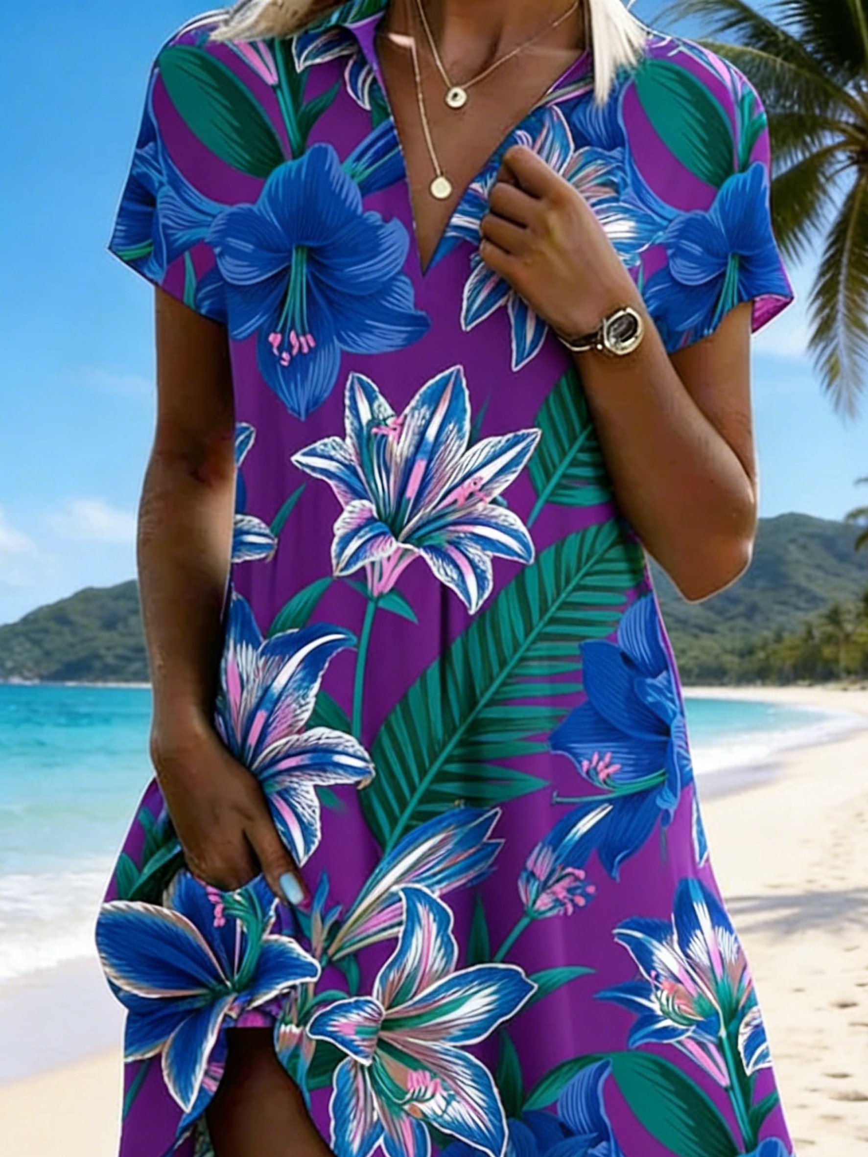 Women's Tropical Printing Short Sleeve V-Neck Summer Beach Vacation Midi Dress