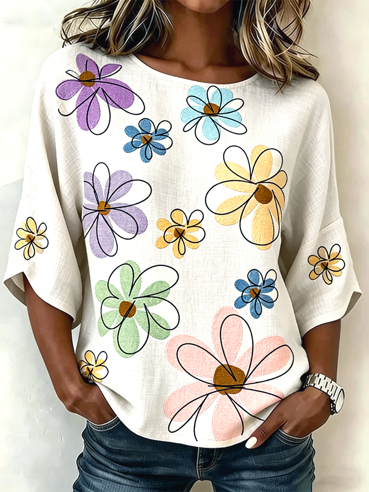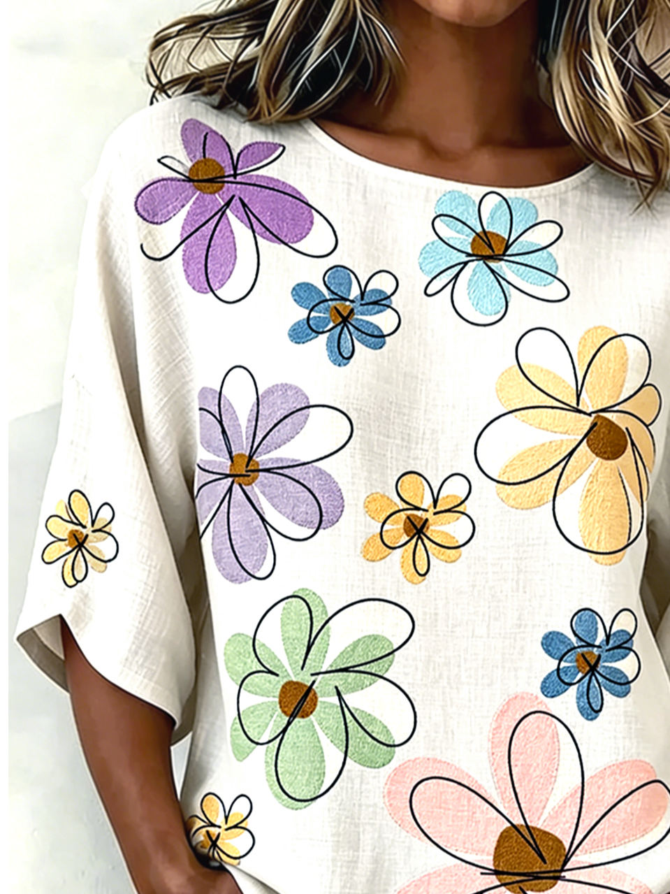 3D Printing Casual Linen Blend Crew Neck Loose Casual Top