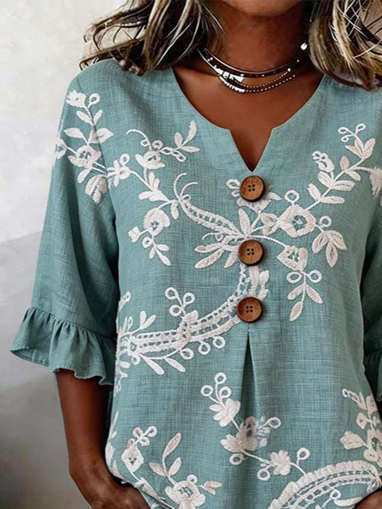 Vintage Cotton-Blend Botanical Pattern V Neck Shirt