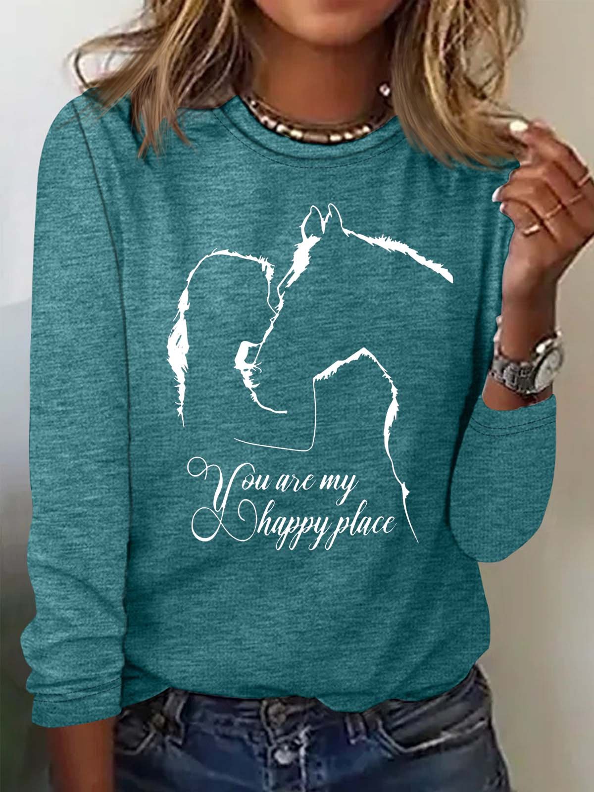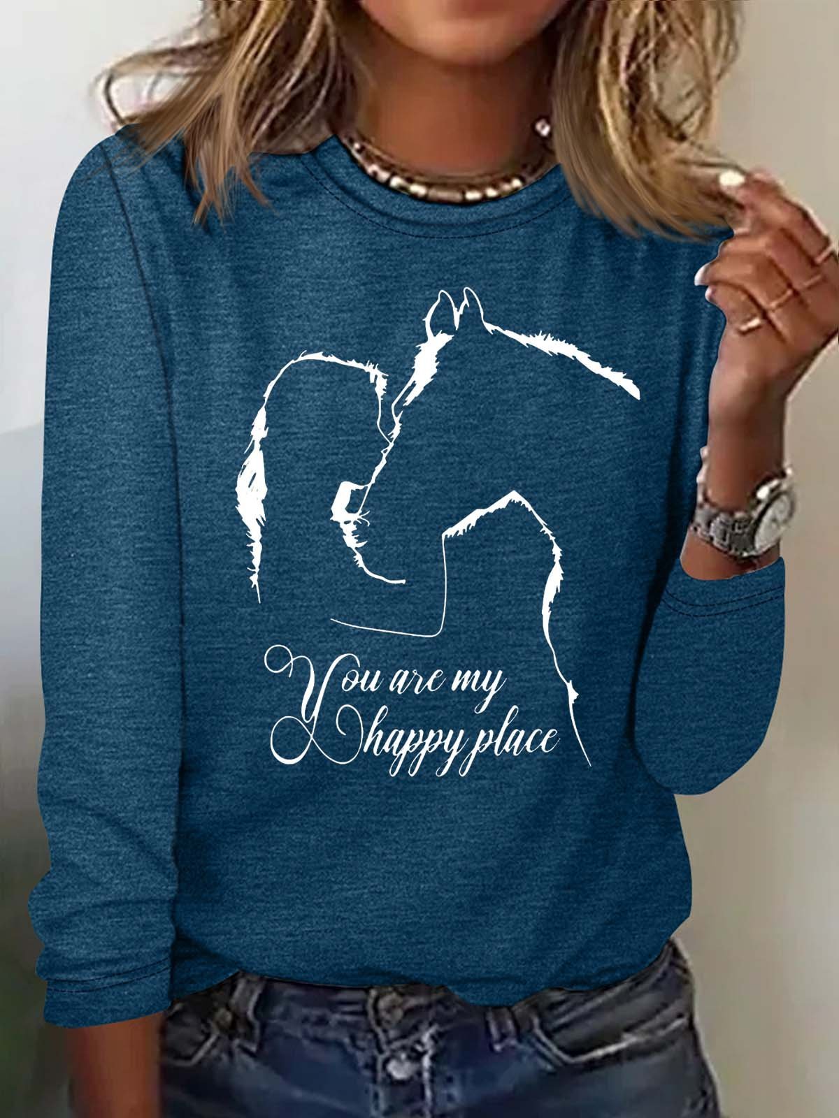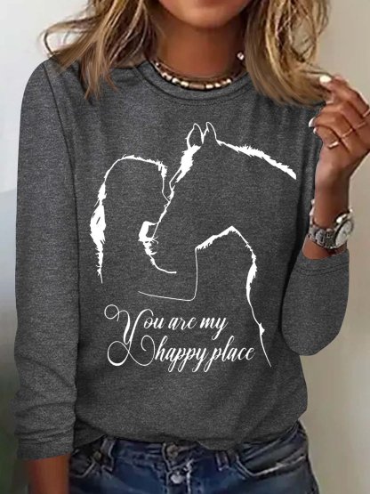 Women's Funny Horse And Girl You Are My Happy Place Print Letters Casual Top