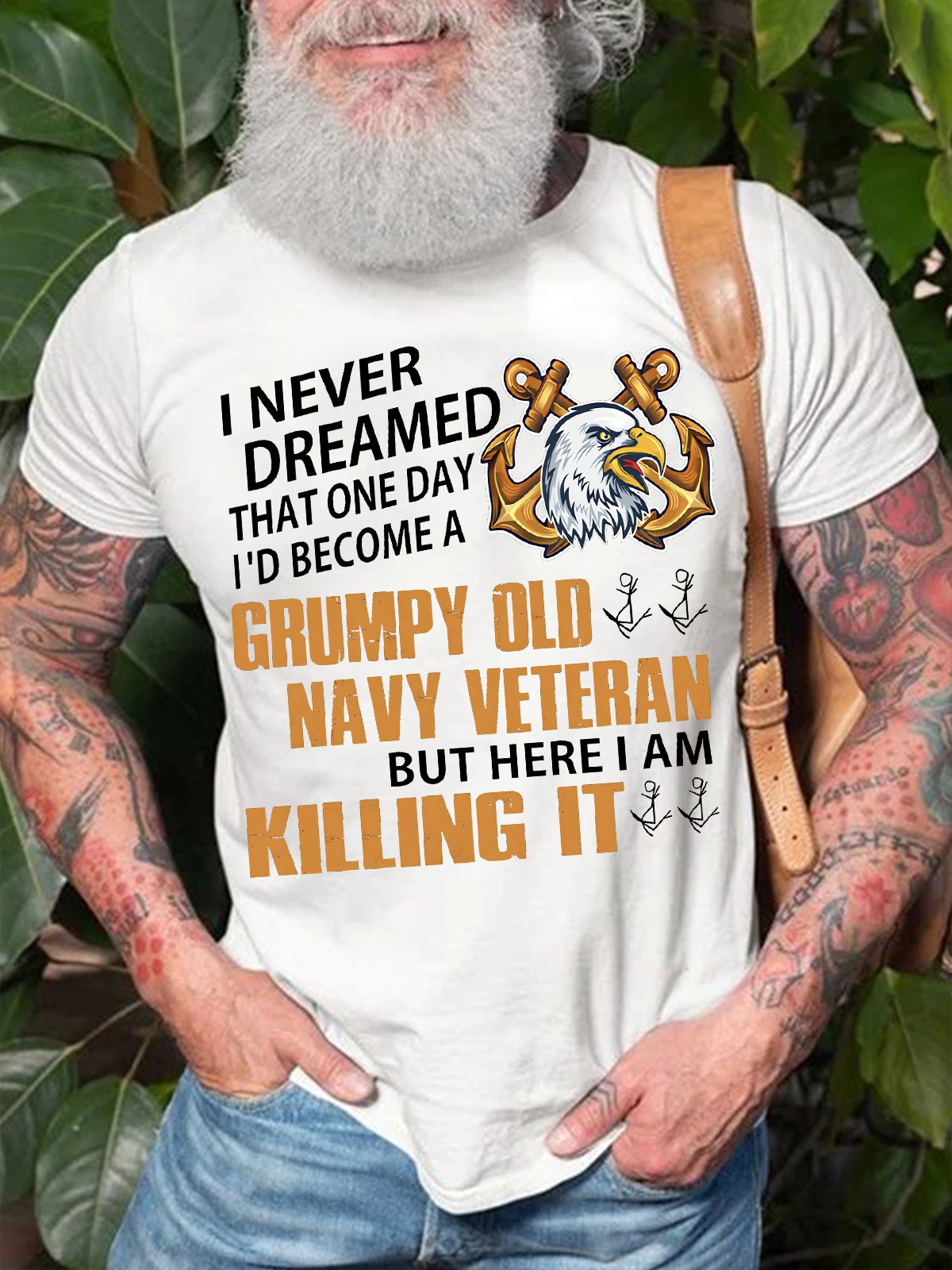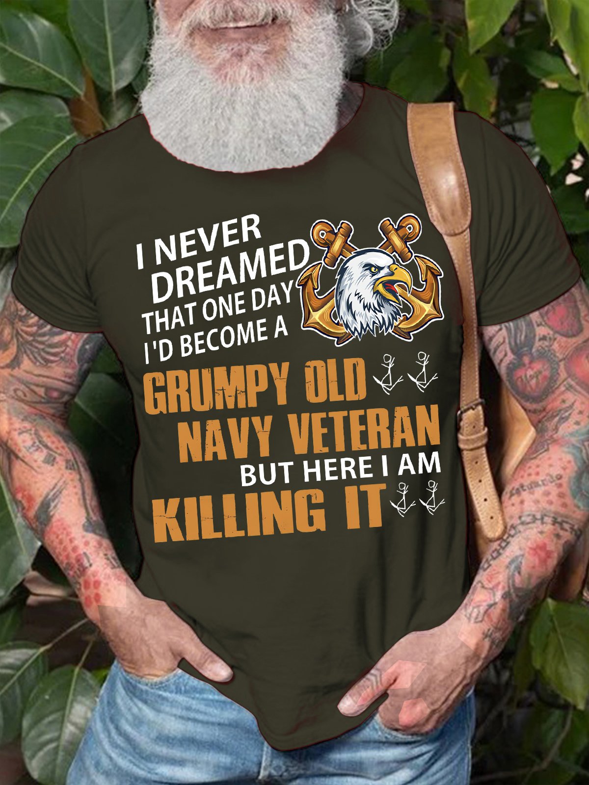 Men's I Never Dreamed That One Day I'd Become A Grumpy Old Navy Veteran Funny Graphic Print Casual Crew Neck Text Letters Cotton T-Shirt