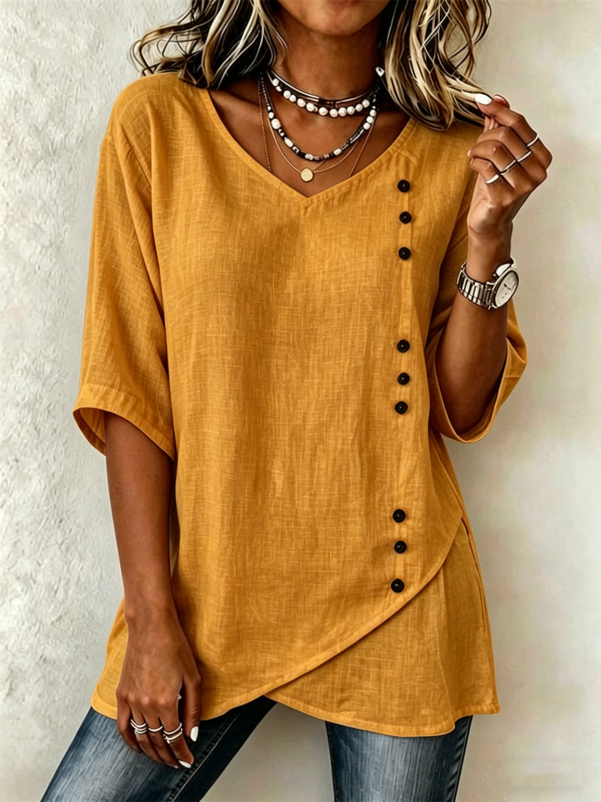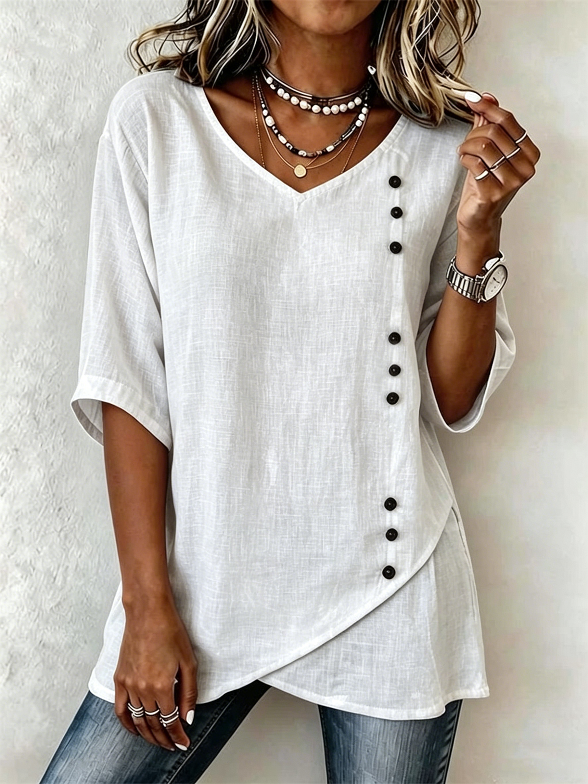 Vintage Loose Cotton-Blend V Neck Shirt