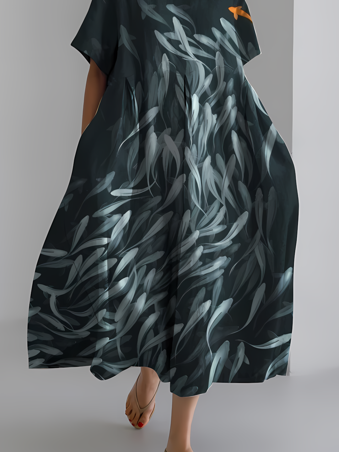 Women's Ocean Art Fish Print Vintage Round Neck Pleated Dress