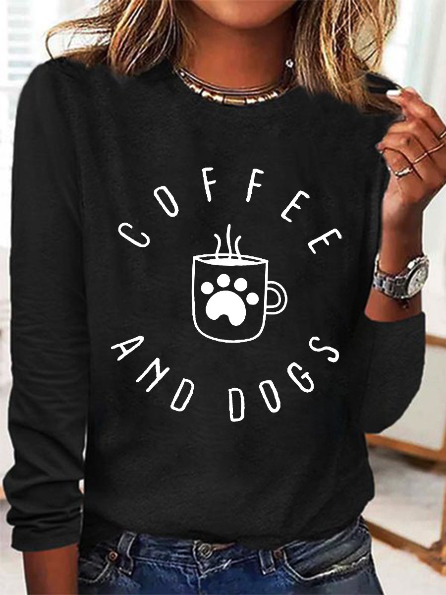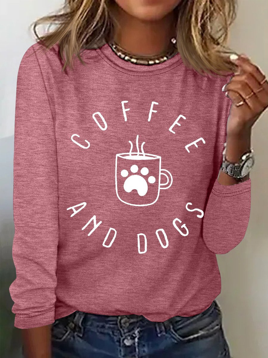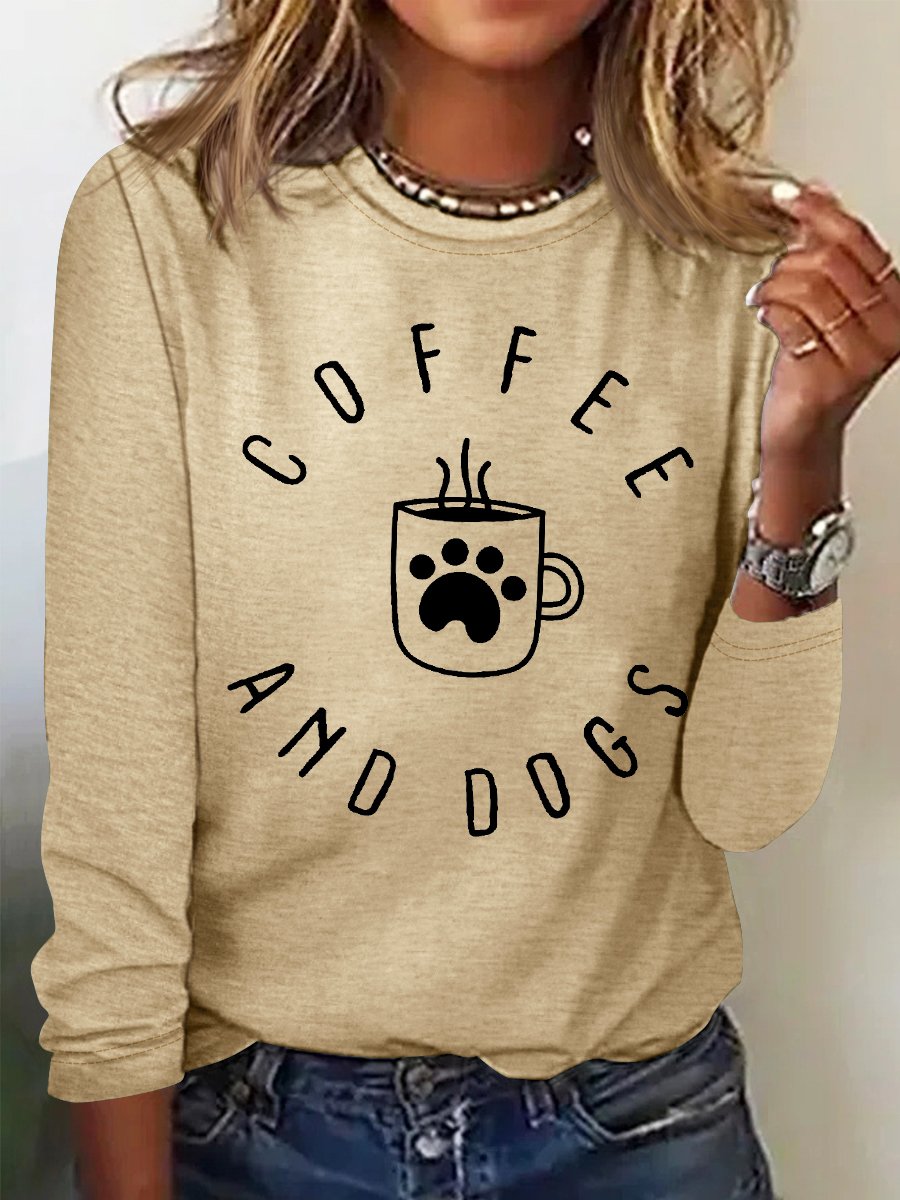 Women's Funny Dog Mama Coffee and Dogs Crew Neck Cotton-Blend Long Sleeve Top