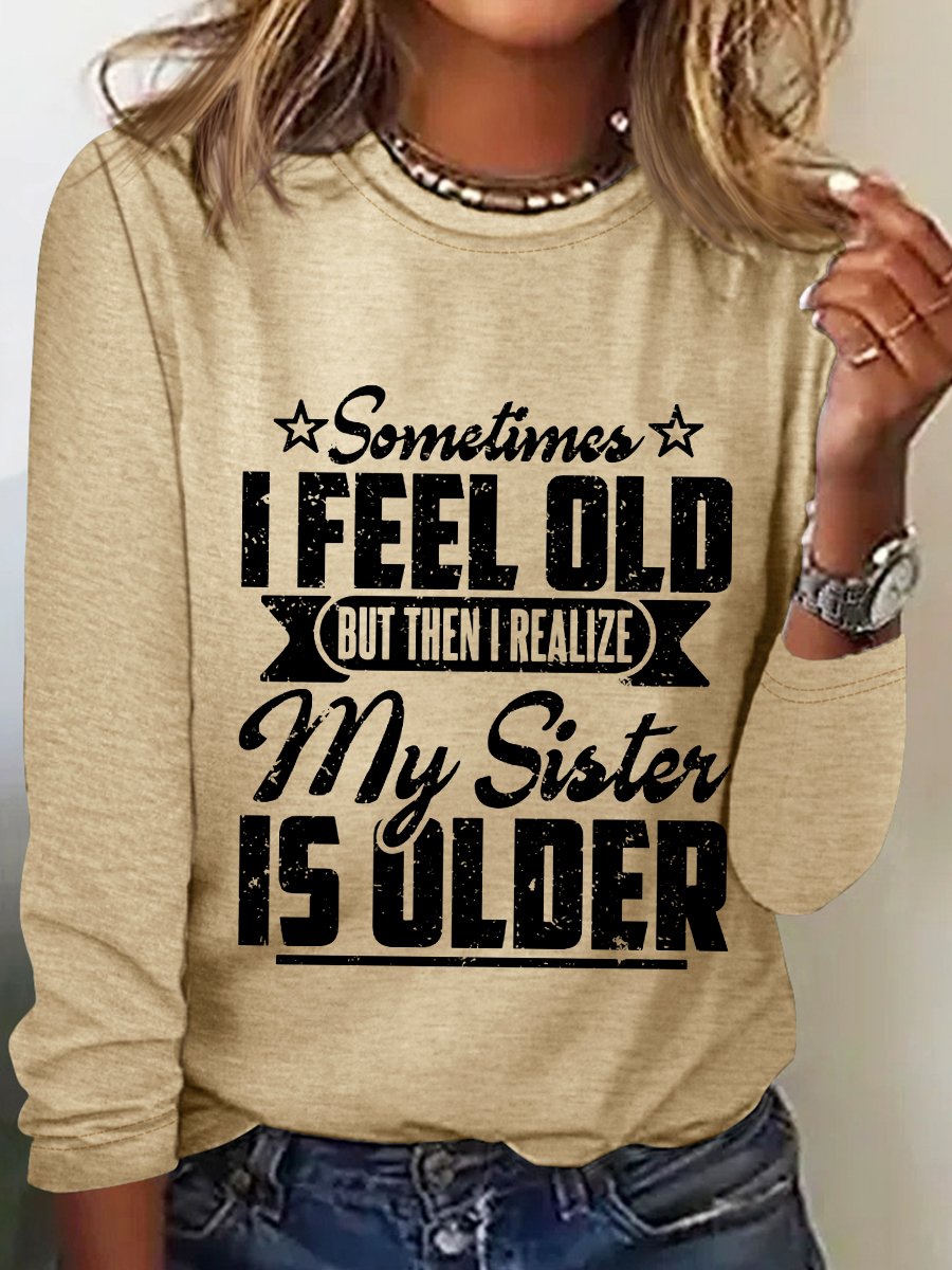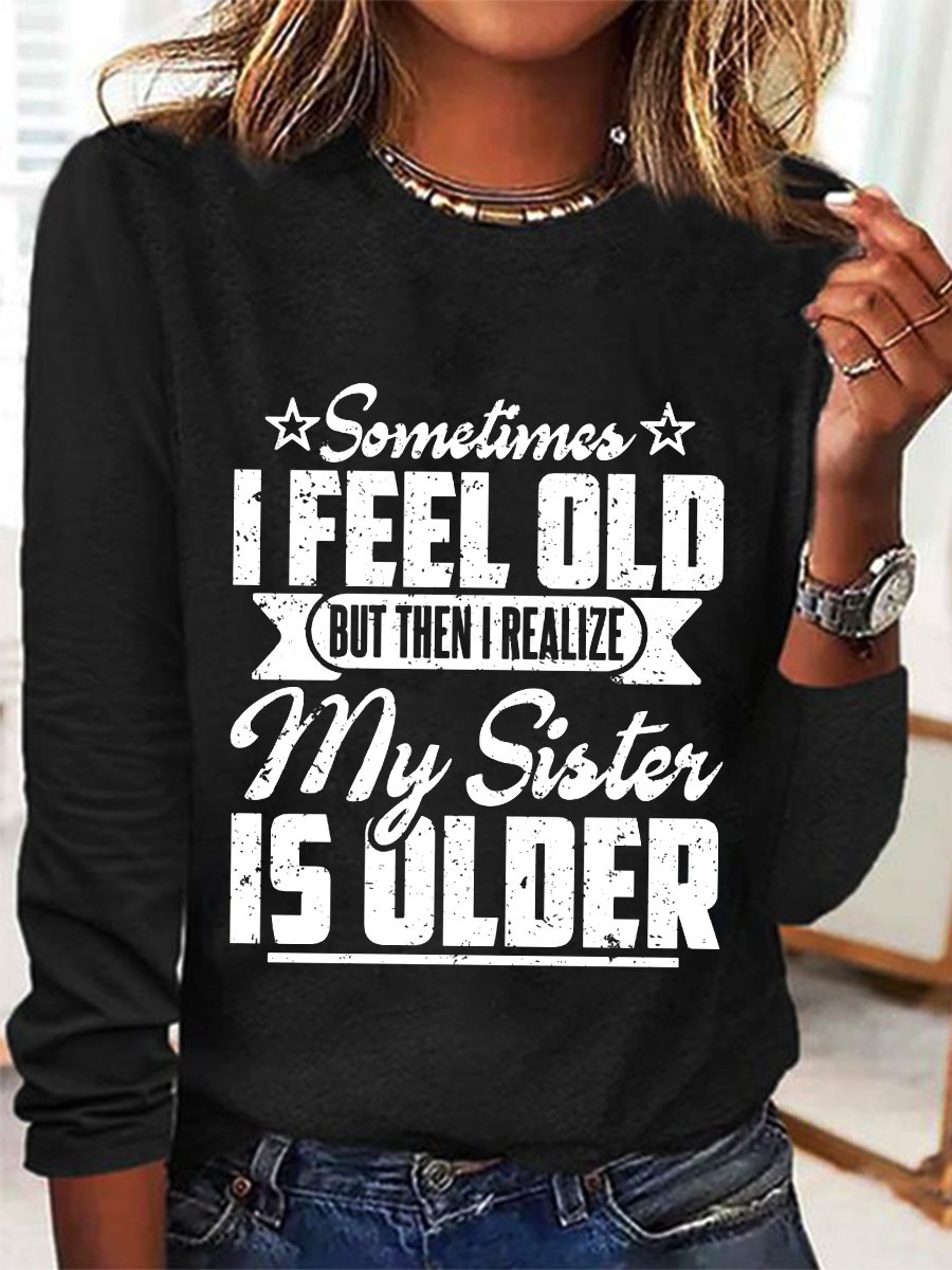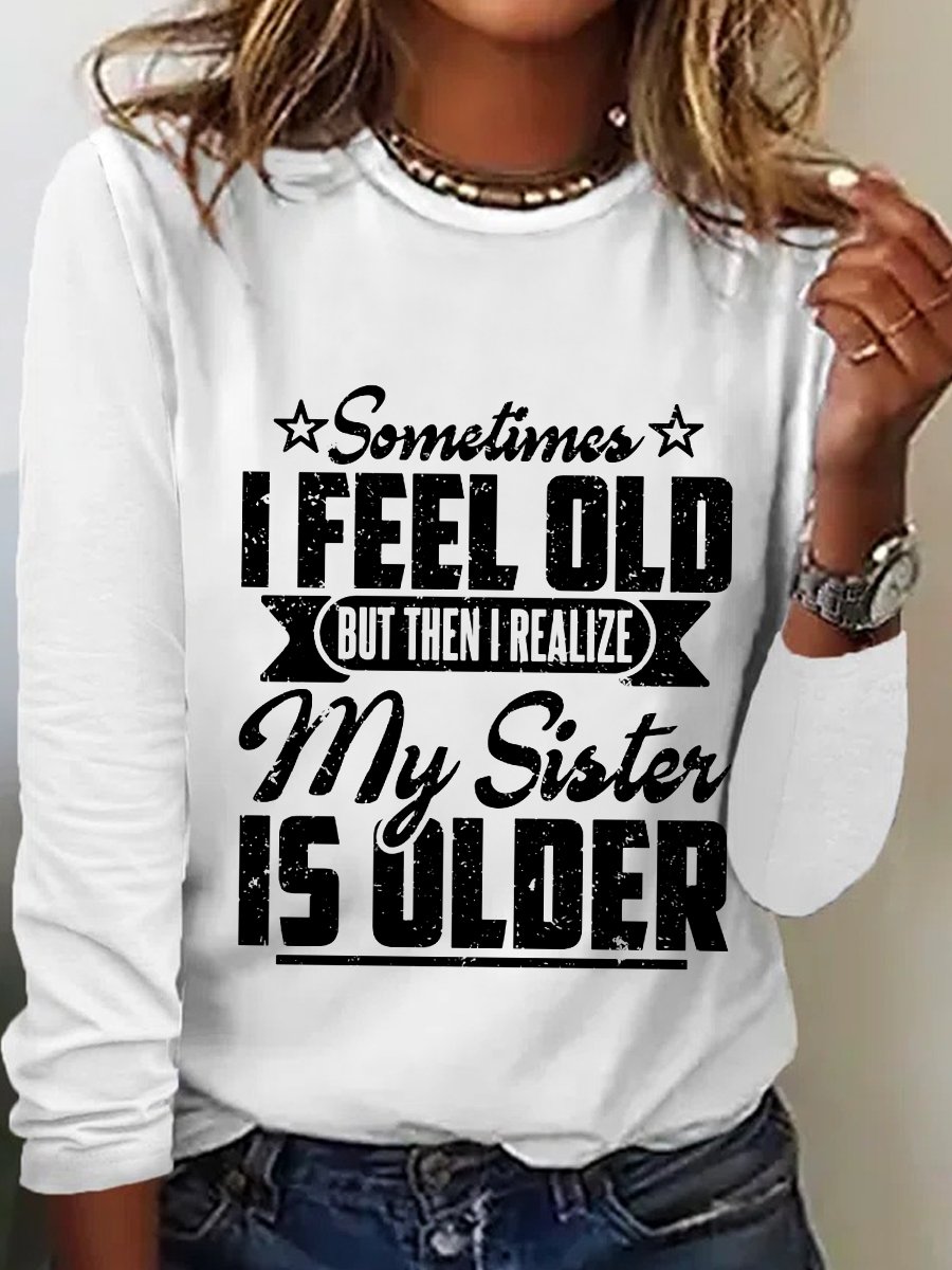Women‘s Funny Word Sometimes I Feel Old But Then I Realize My Sister Is Older Text Letters Long Sleeve Top