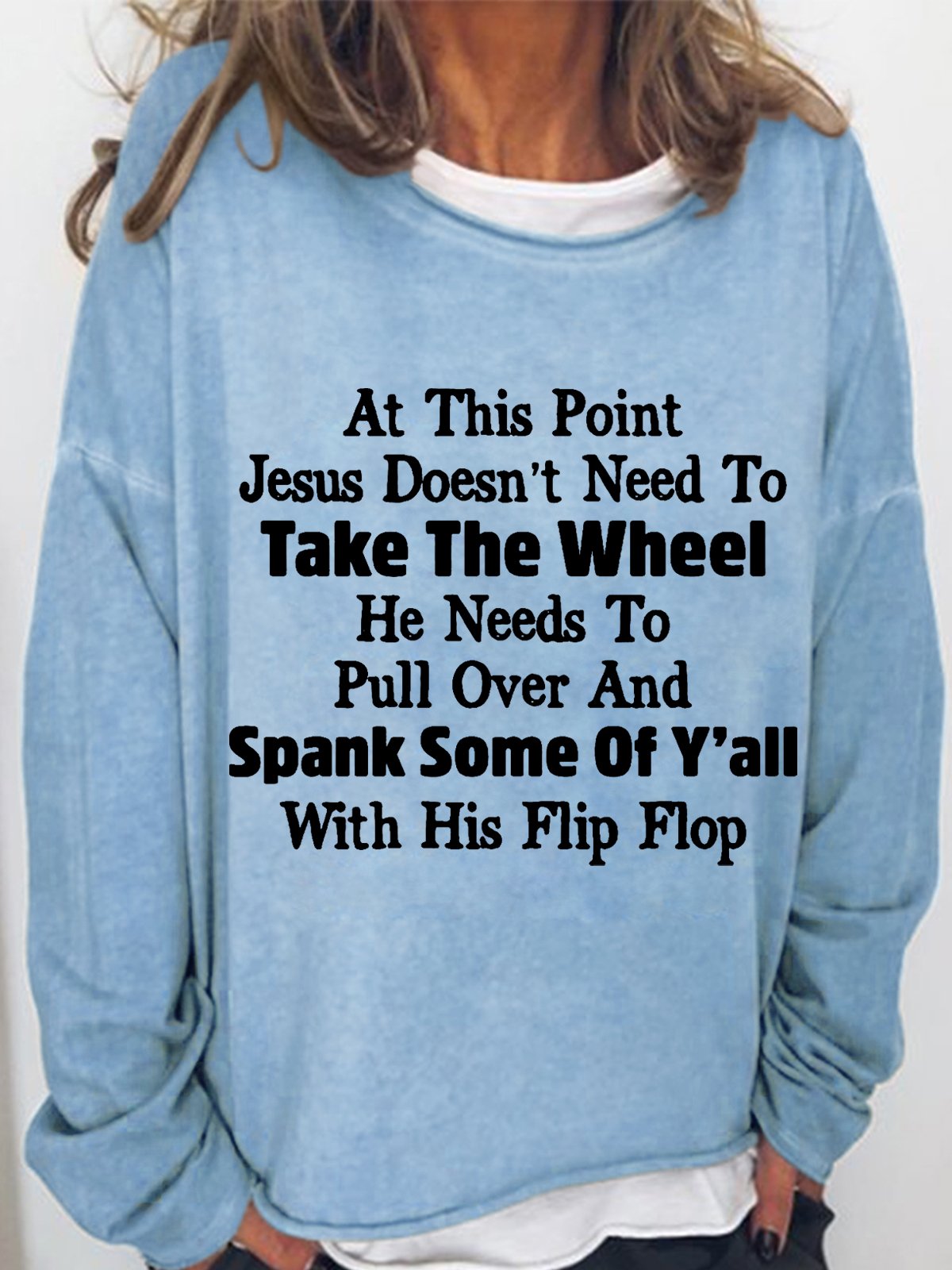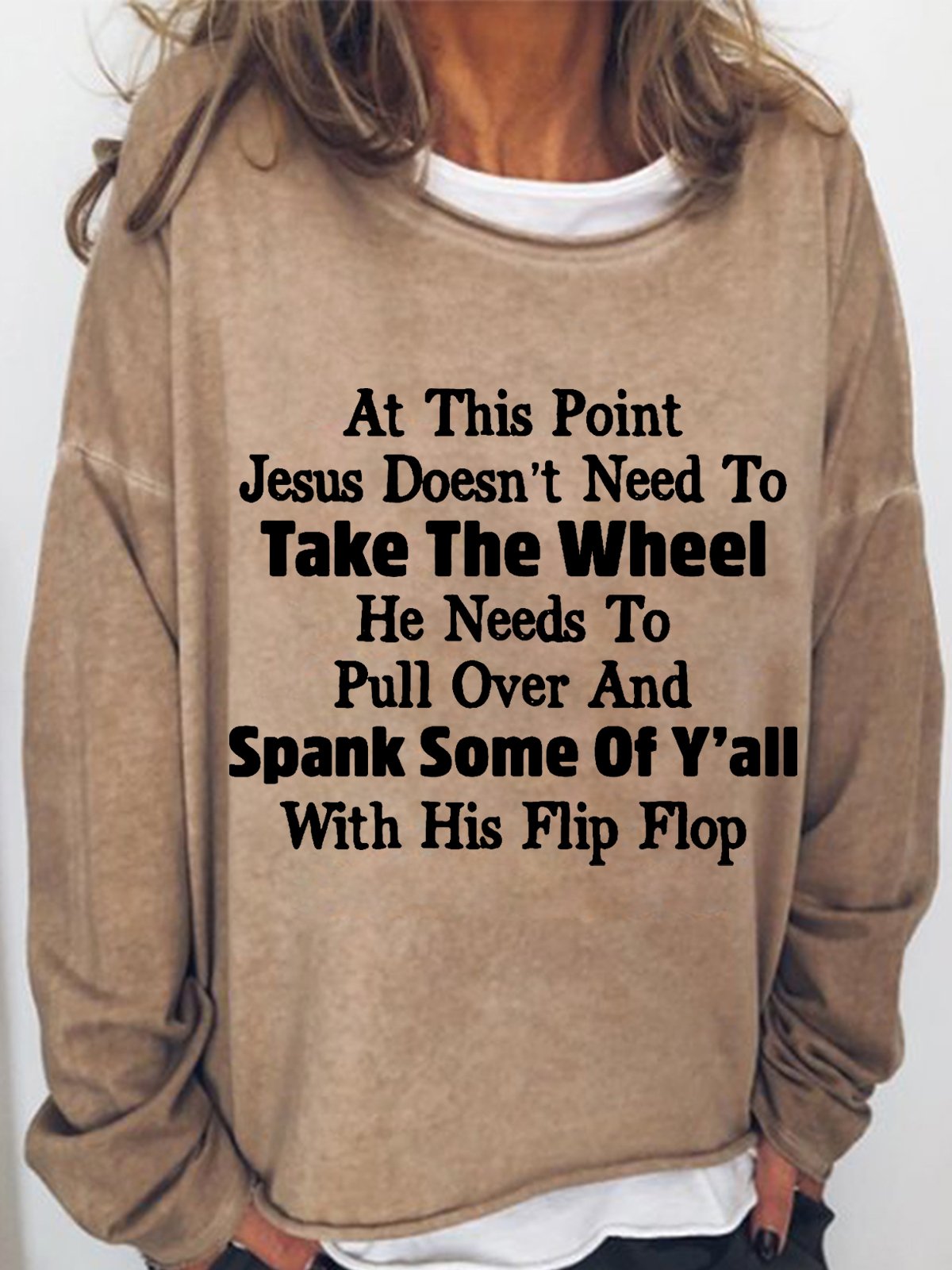 Women's Funny Word At This Point Jesus Doesn’t Need Simple Crew Neck Text Letters Loose Sweatshirt