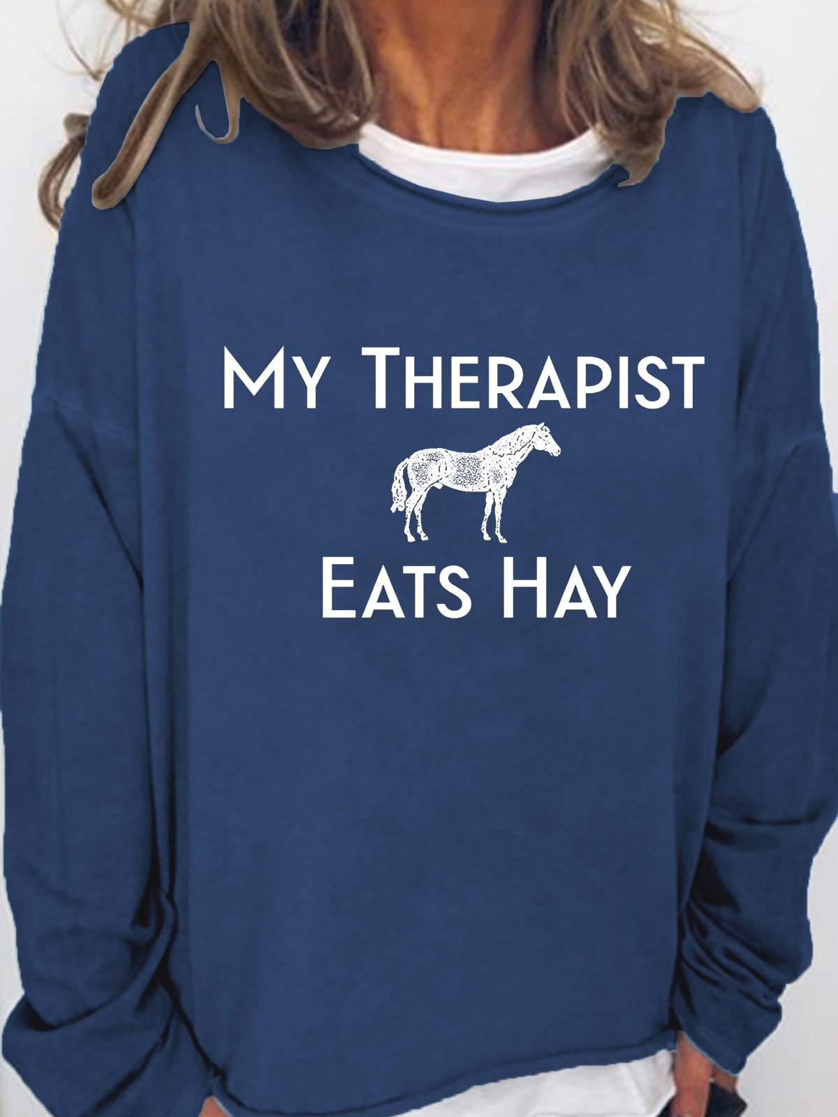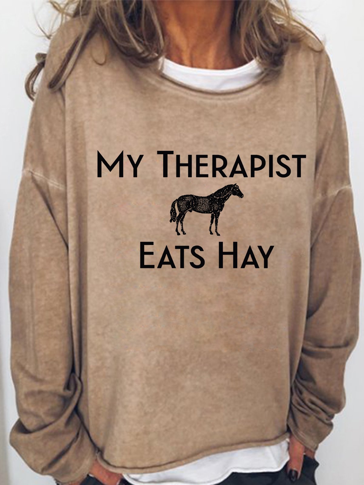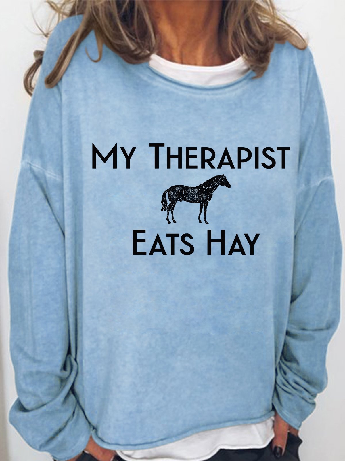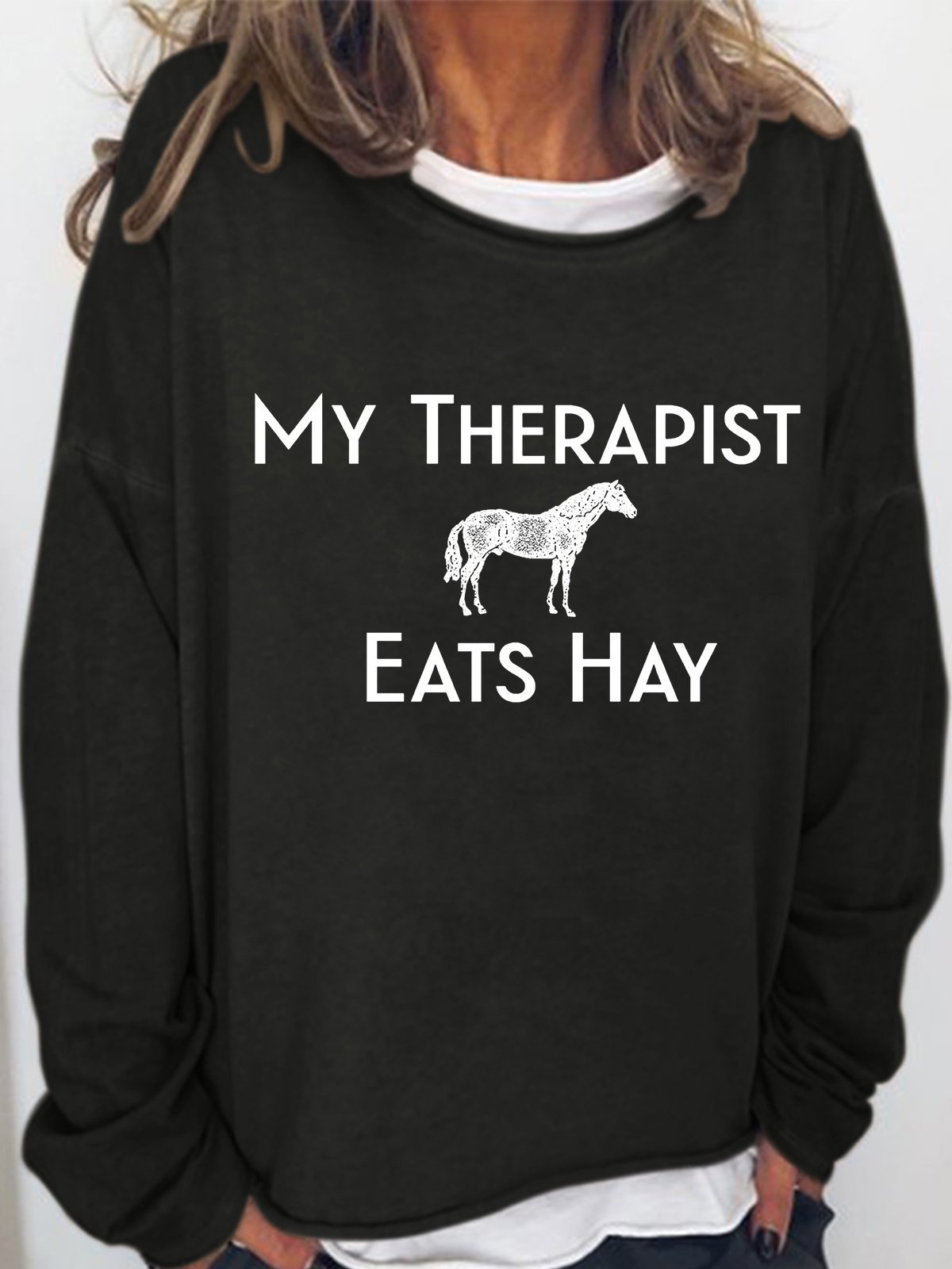 Women‘s Funny Word Horse Lover My Therapist Eats Hay Crew Neck Simple Sweatshirt