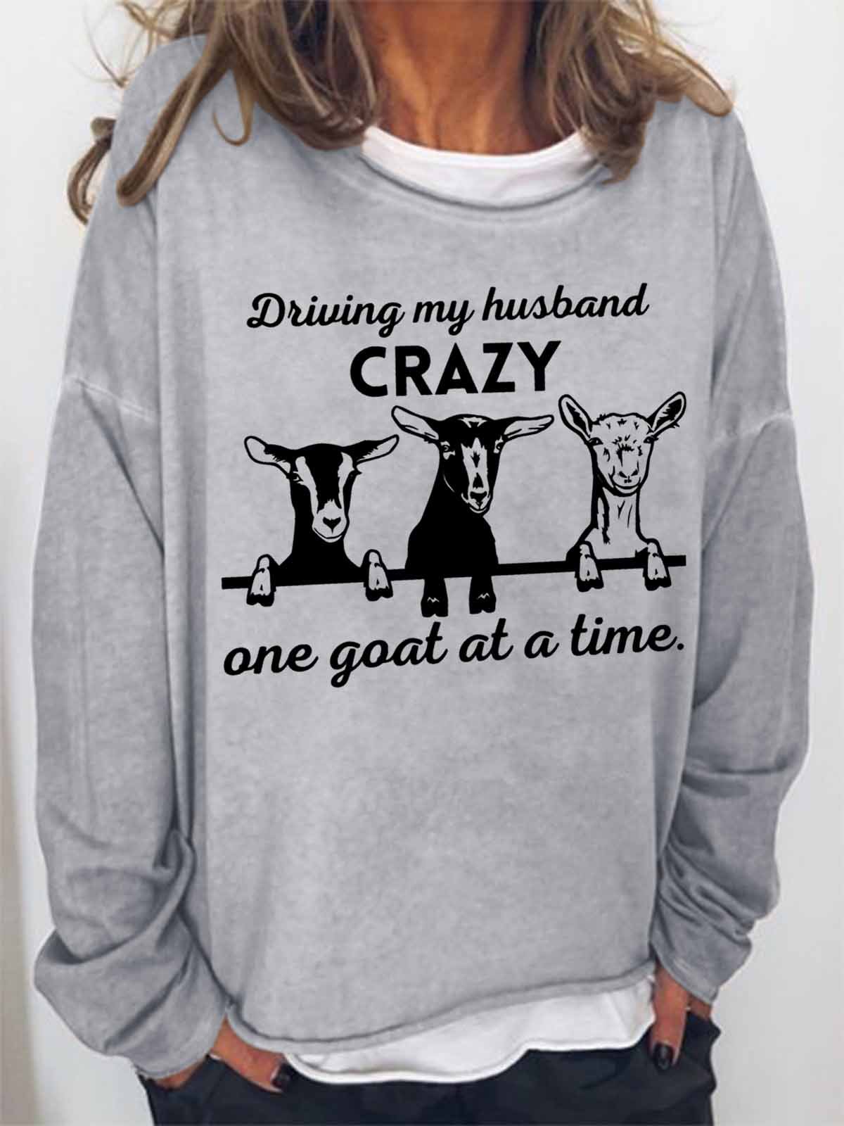 Women's Funny Word Driving My Husband Crazy One Goat at a Time Text Letters Sweatshirt