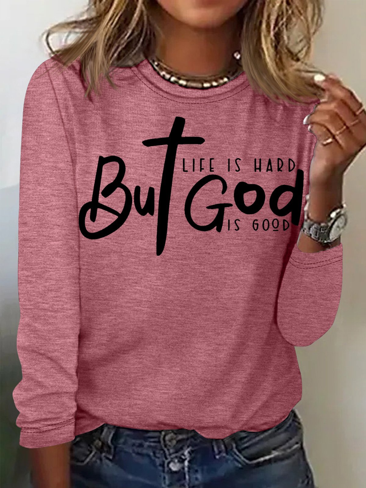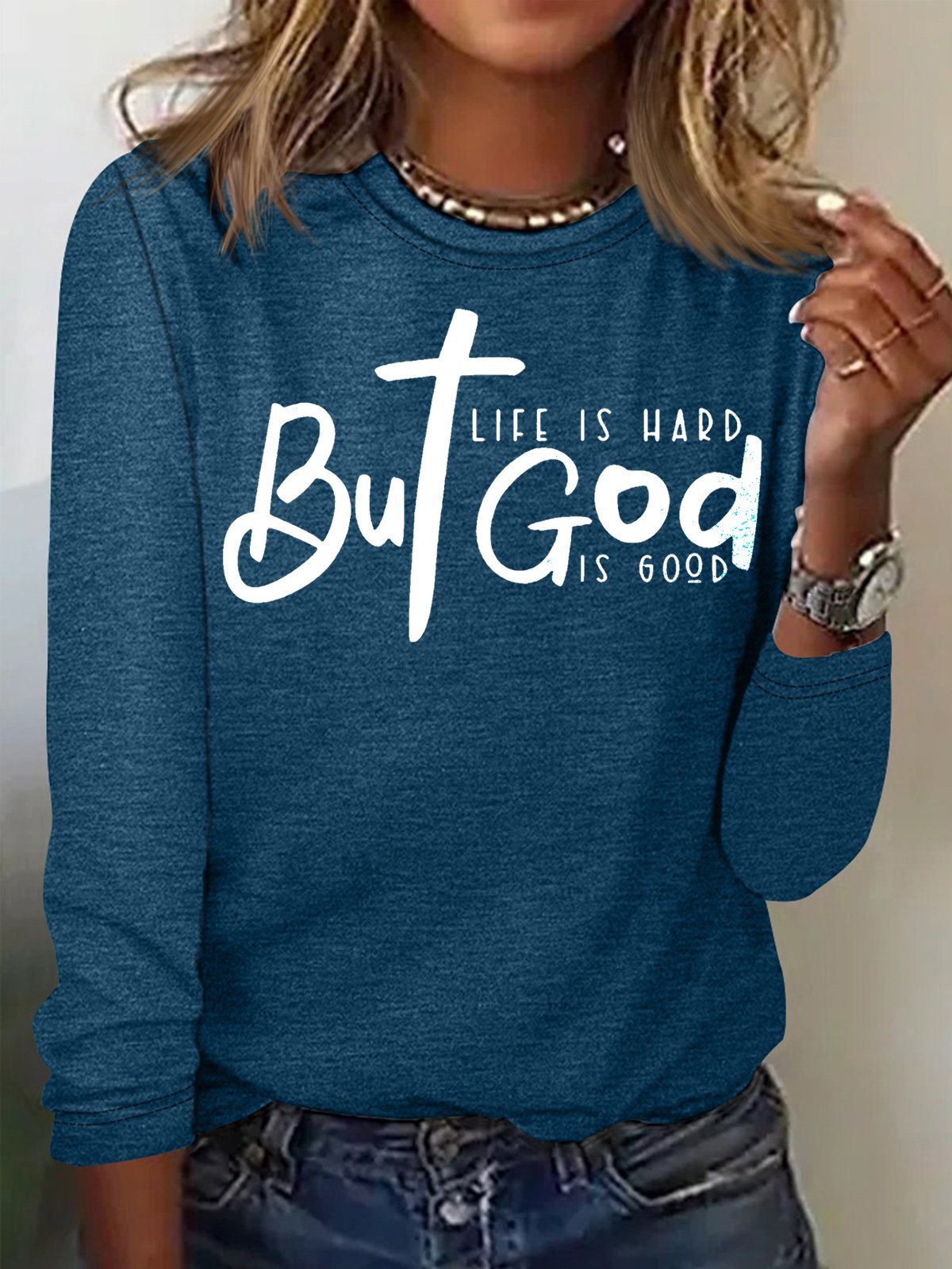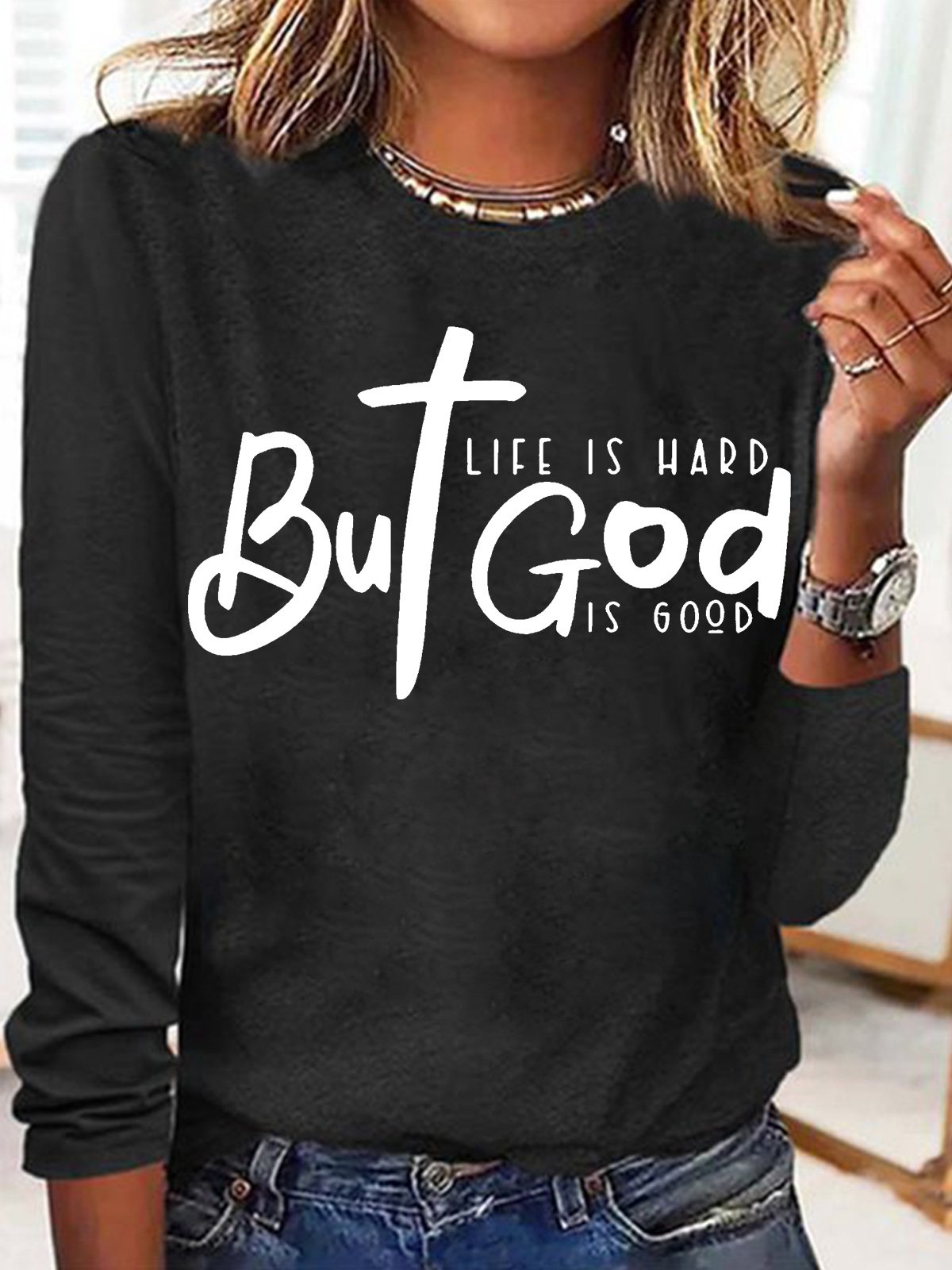 Women's Life is hard but God is Good Christian Quote Crew Neck Casual Top
