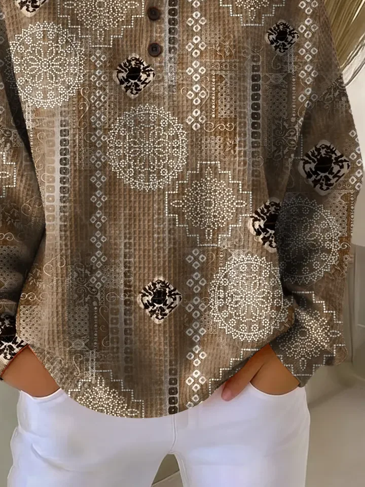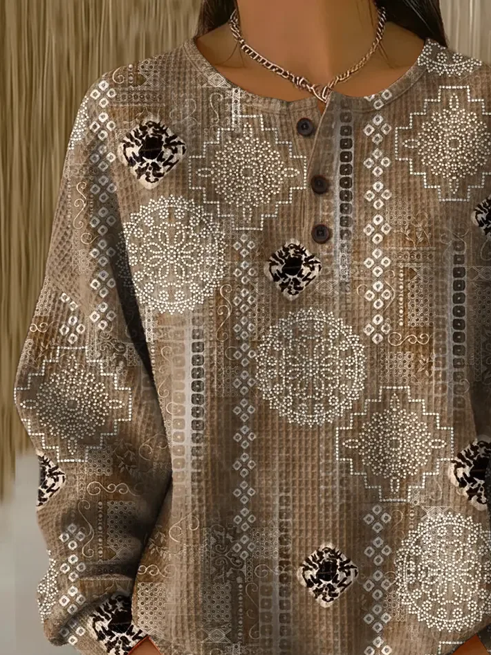 Women's Abstract Print Button-Up Casual Waffle Knit Sweatshirt