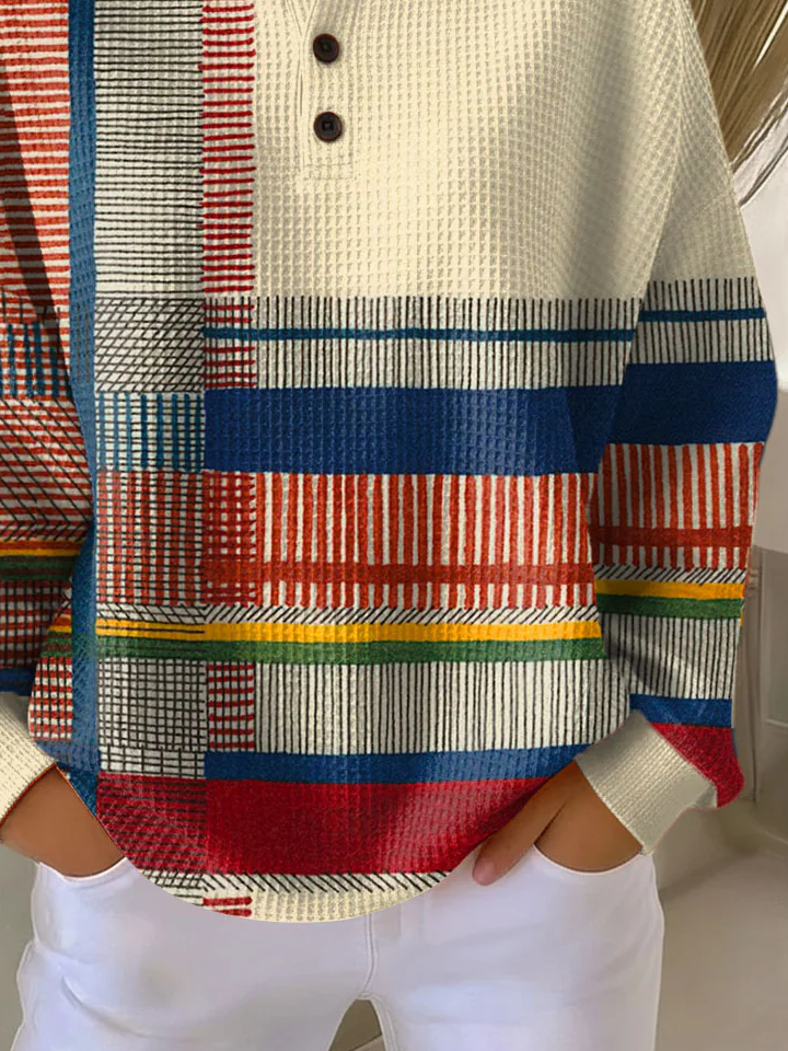 Women's Abstract Print Button-Up Casual Waffle Knit Sweatshirt
