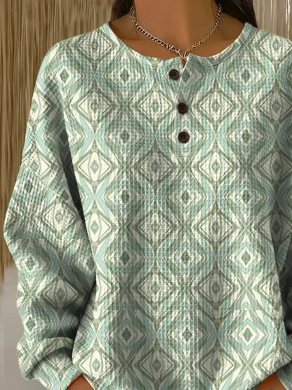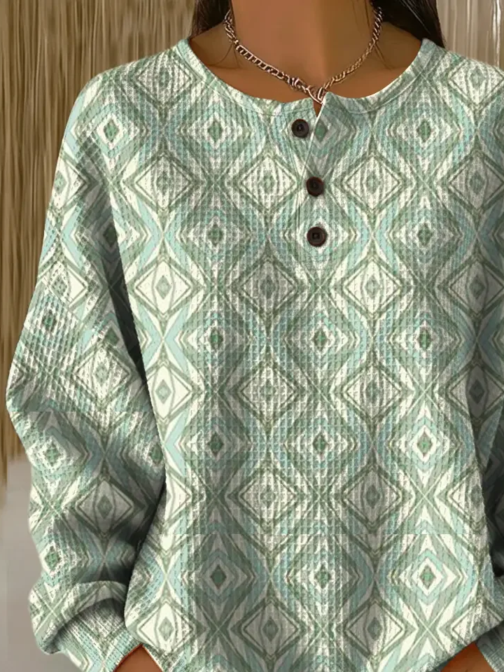 Women's Abstract Print Button-Up Casual Waffle Knit Sweatshirt