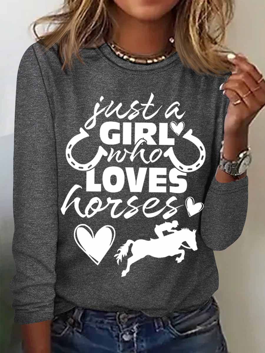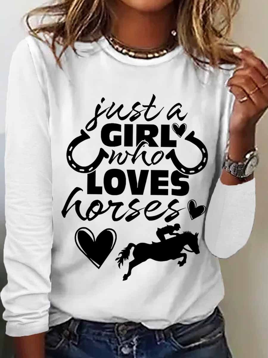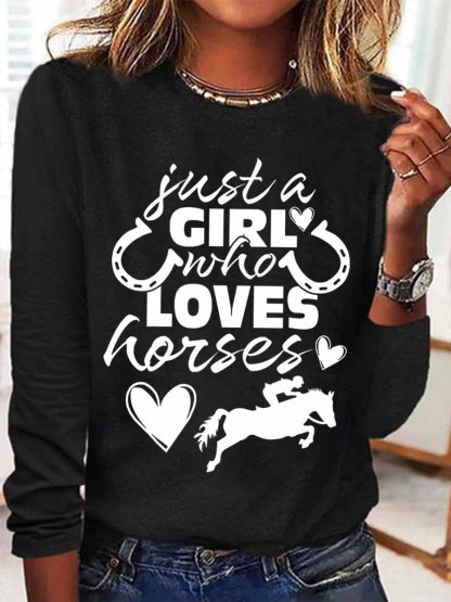 Women's Funny Just a Girl Who Loves Horses Text Letters Regular Fit Cotton-Blend Long Sleeve Top